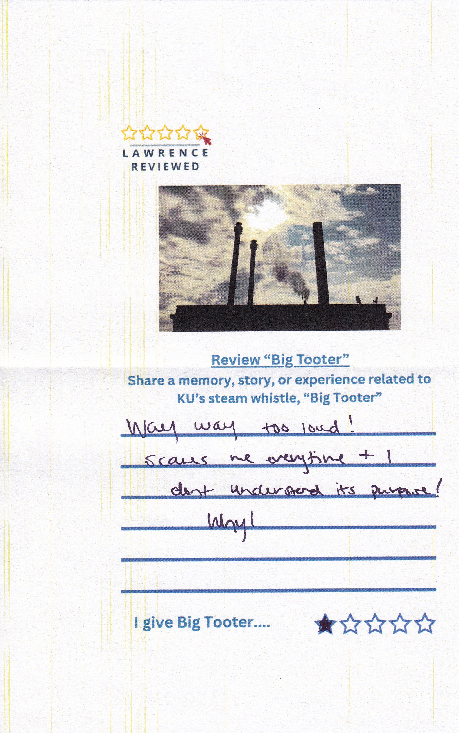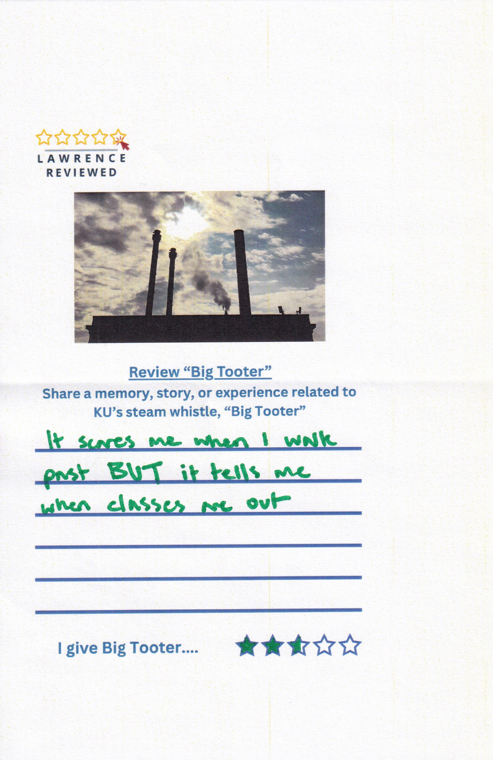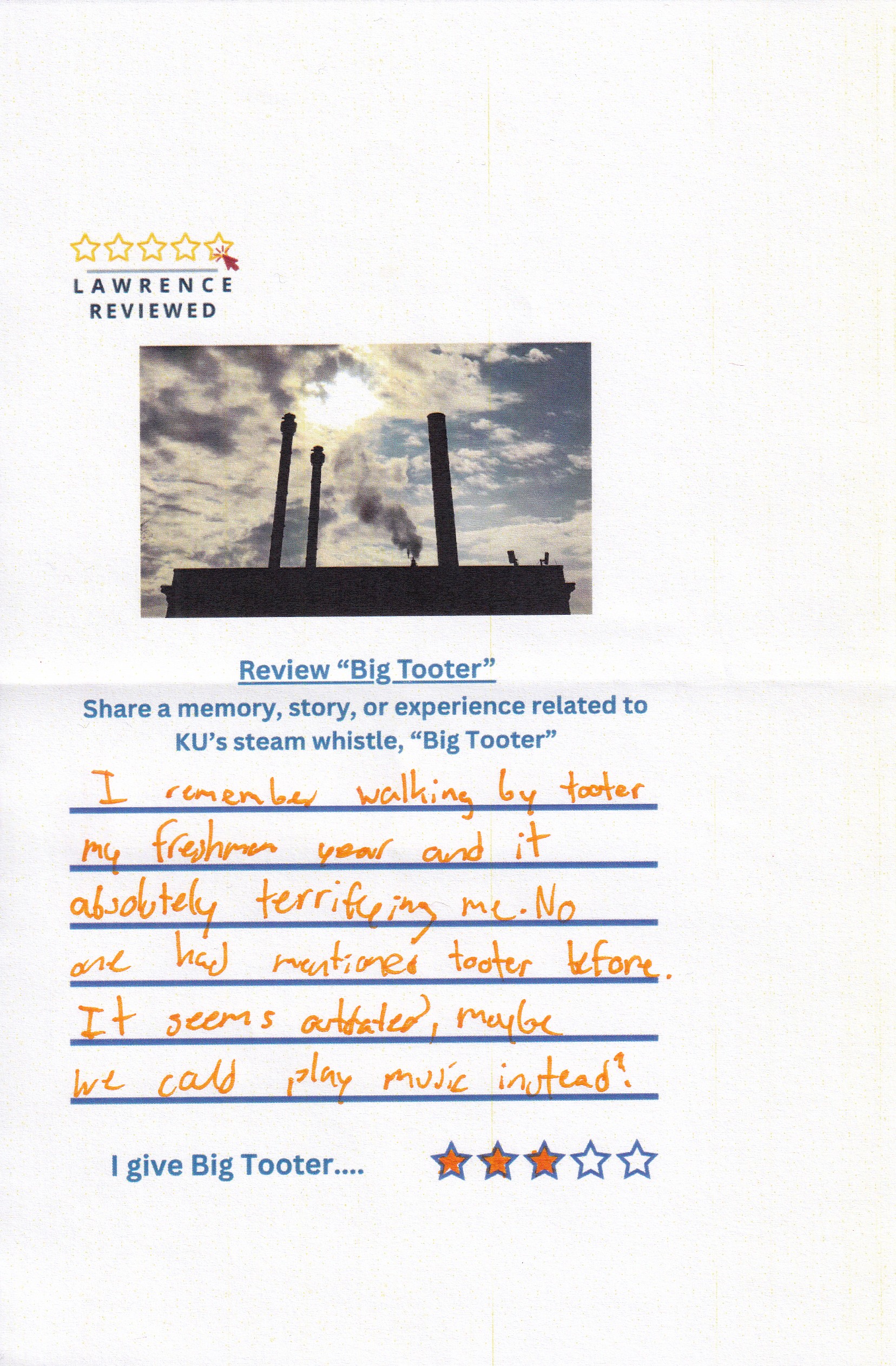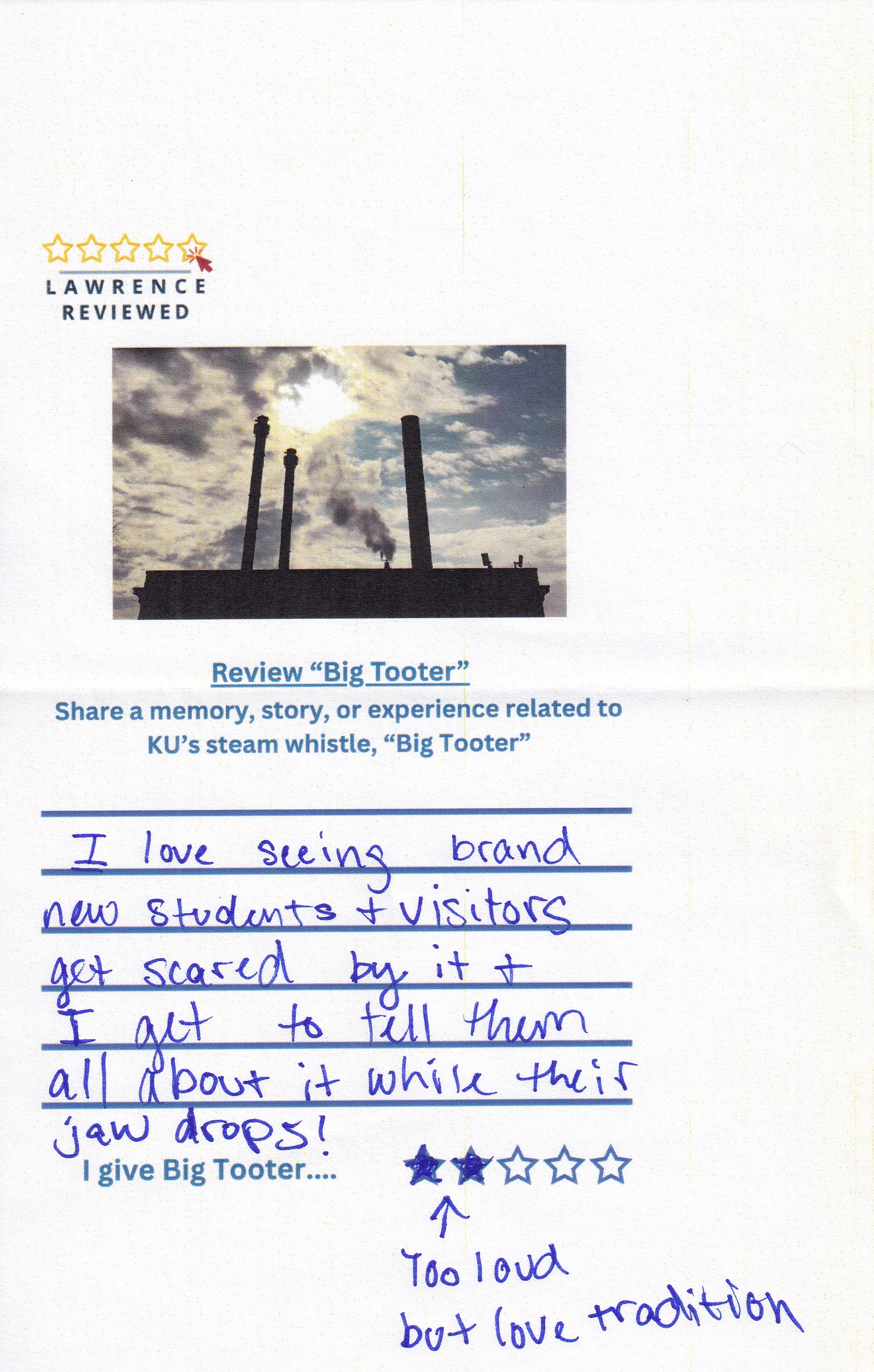 On October 22, 2025, Lawrence Reviewed set up outside of Watson Library, where we asked passersby to review KU’s steam whistle, “Big Tooter”. Explore their responses in the gallery below.