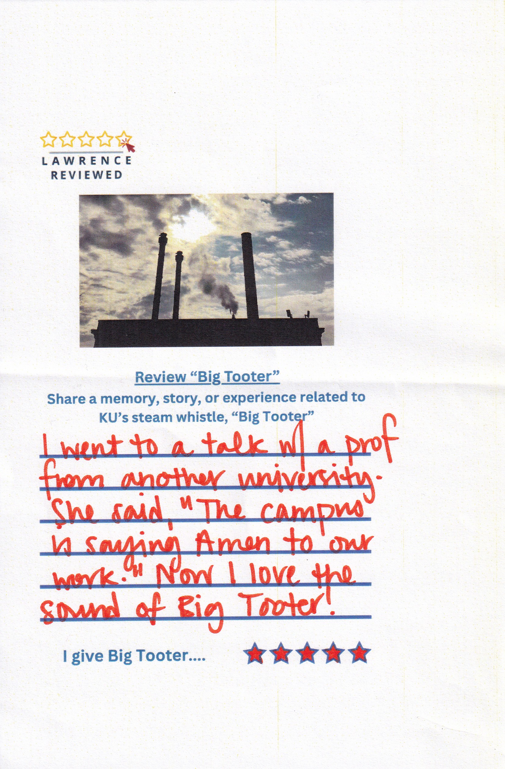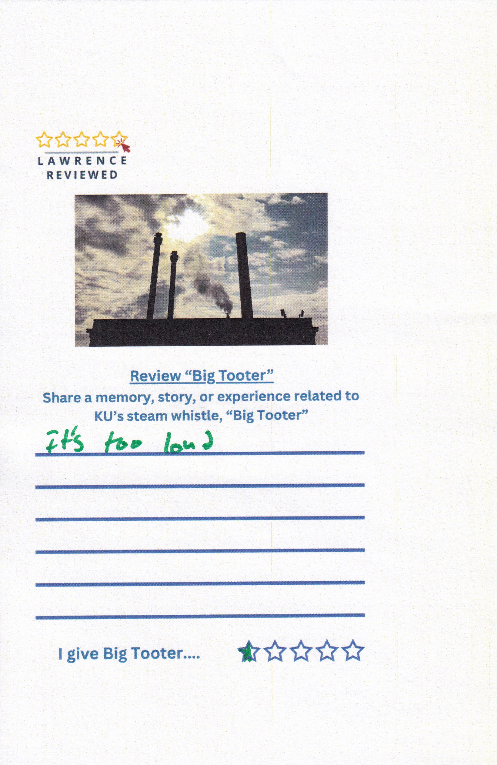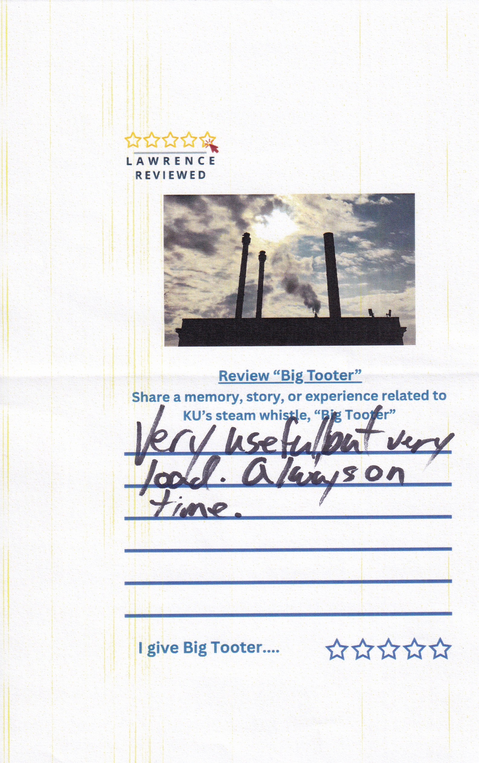 On October 22, 2025, Lawrence Reviewed set up outside of Watson Library, where we asked passersby to review KU’s steam whistle, “Big Tooter”. Explore their responses in the gallery below.