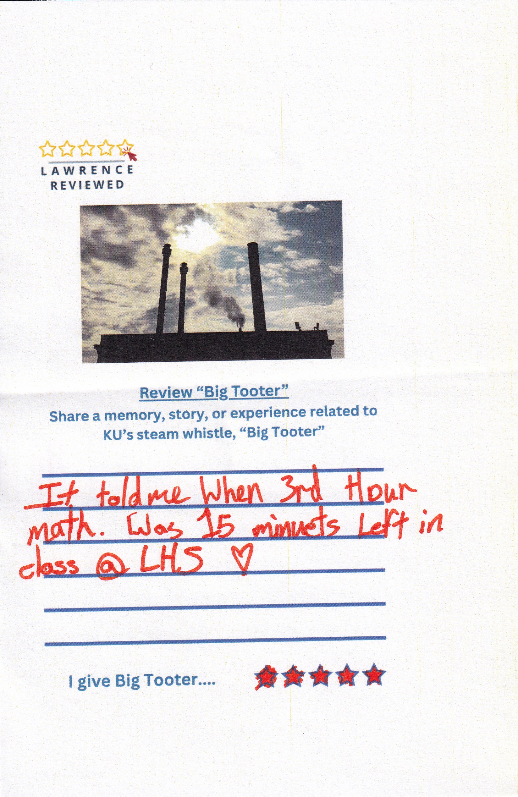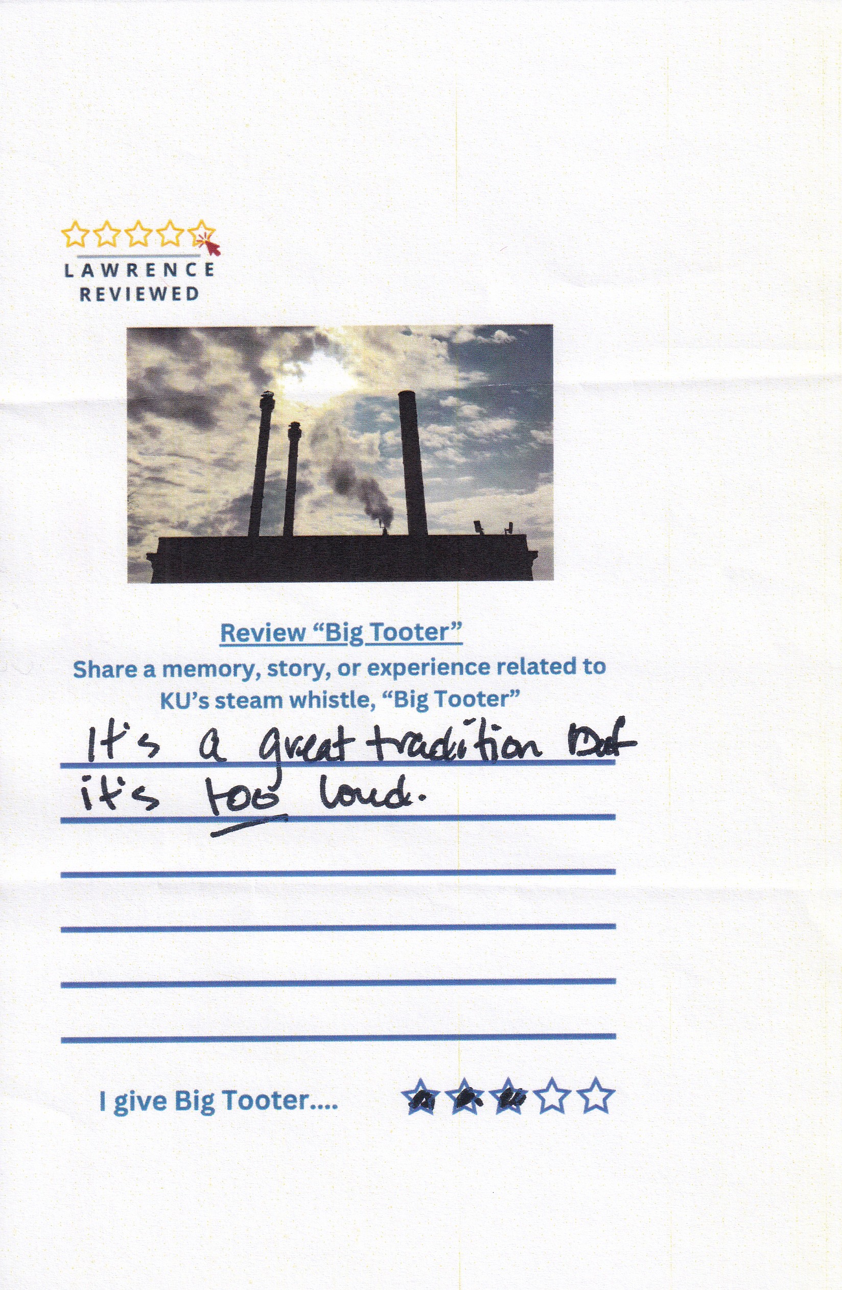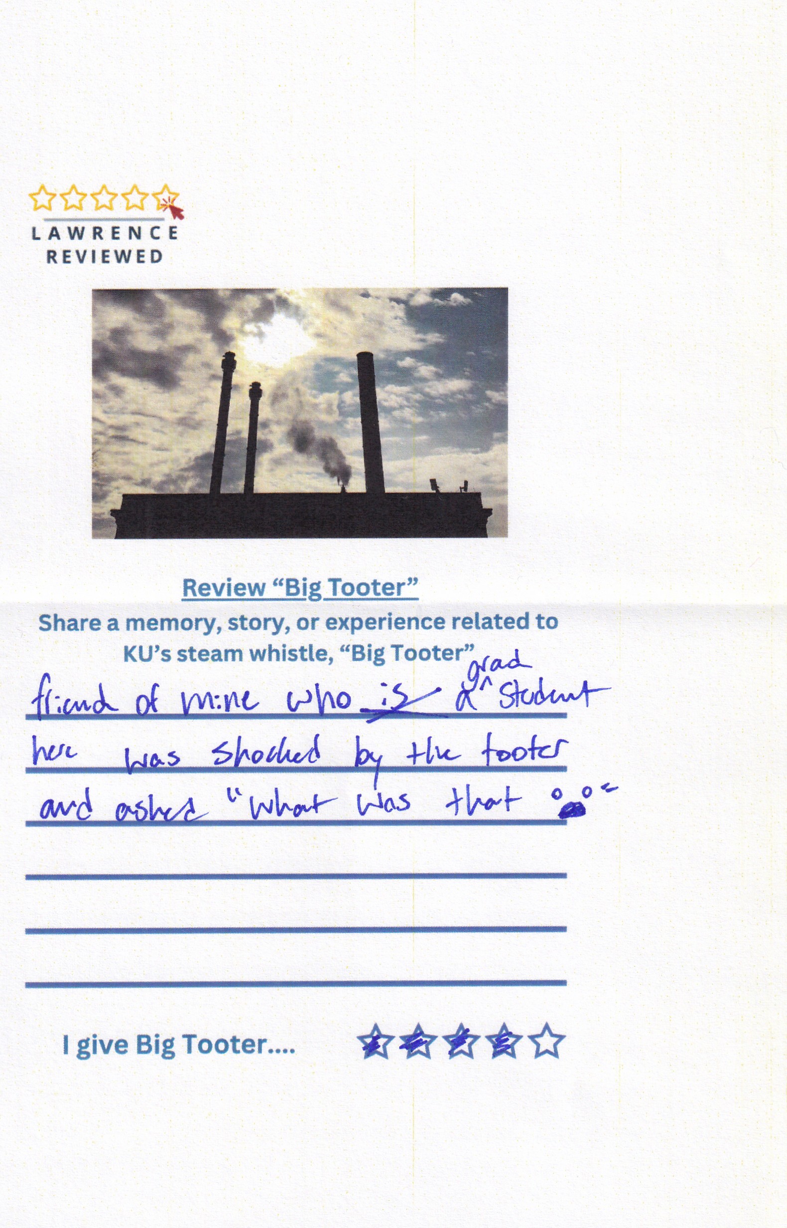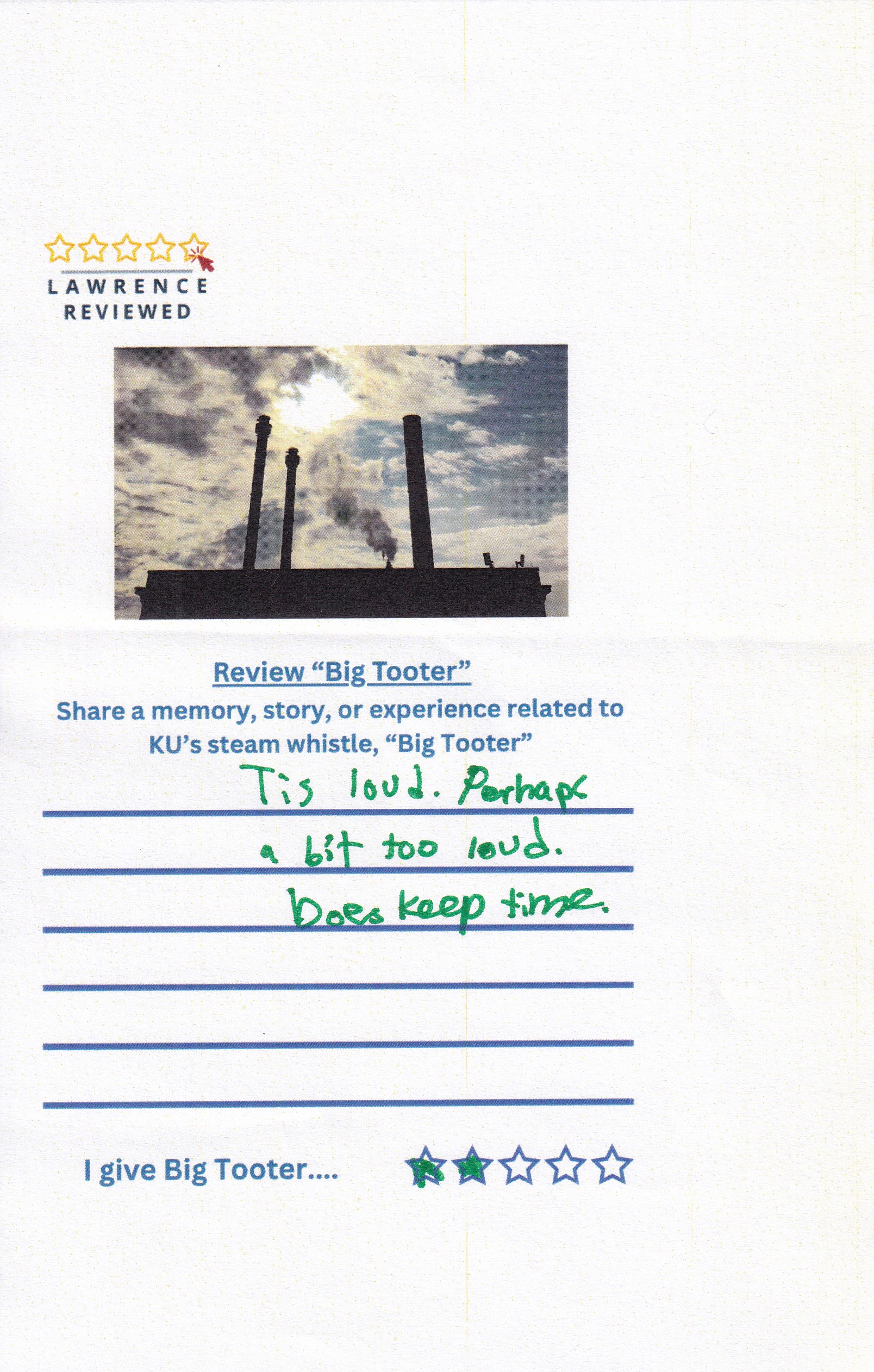 On October 22, 2025, Lawrence Reviewed set up outside of Watson Library, where we asked passersby to review KU’s steam whistle, “Big Tooter”. Explore their responses in the gallery below.