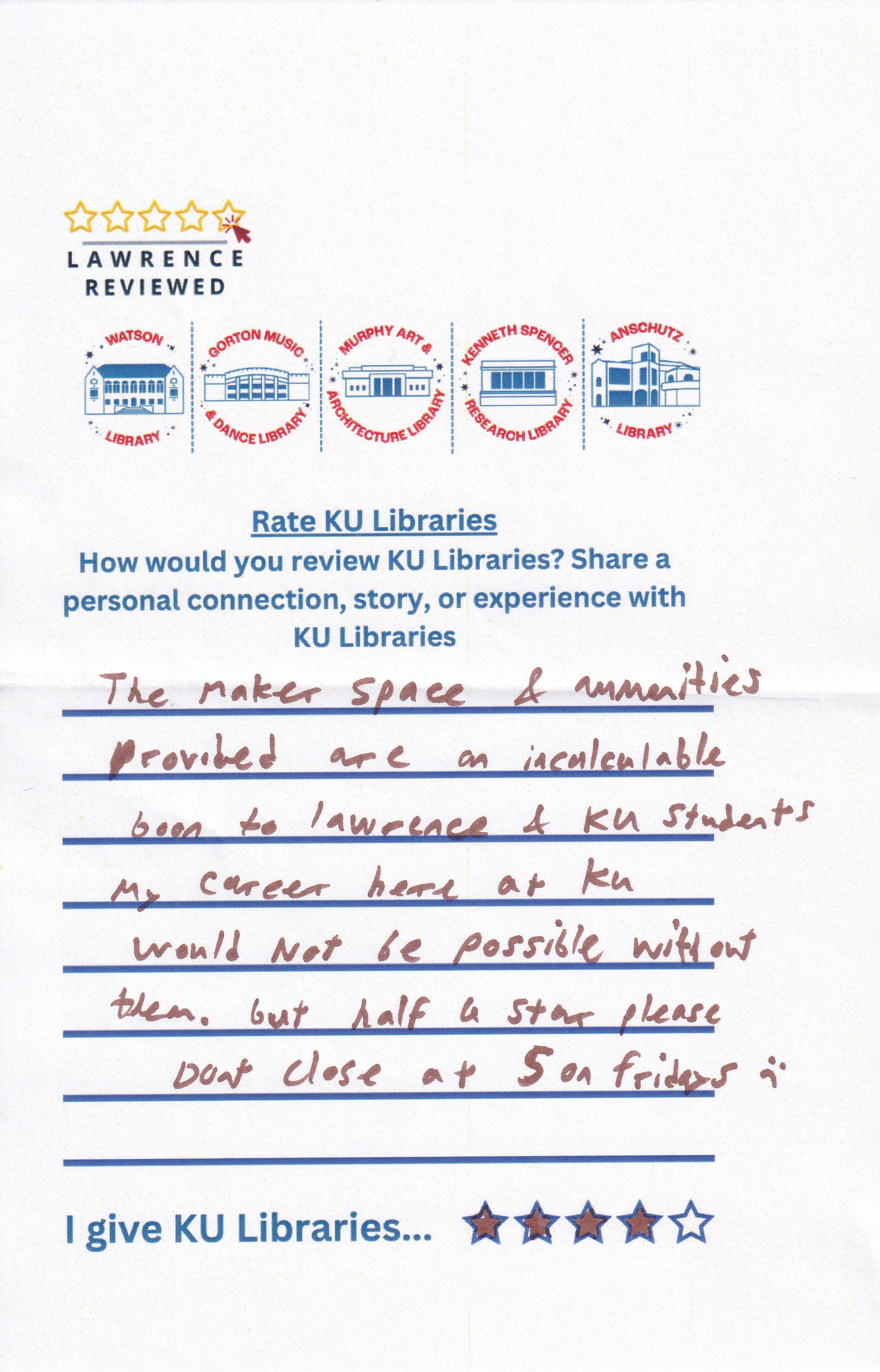 For all that they are, and all that they strive to be, I give KU Libraries 4 stars. May the fifth, yet to be fulfilled star sit like space on the shelf, open and full of promise, a place for the new discoveries we will make, and new points of view, yet to be heard.