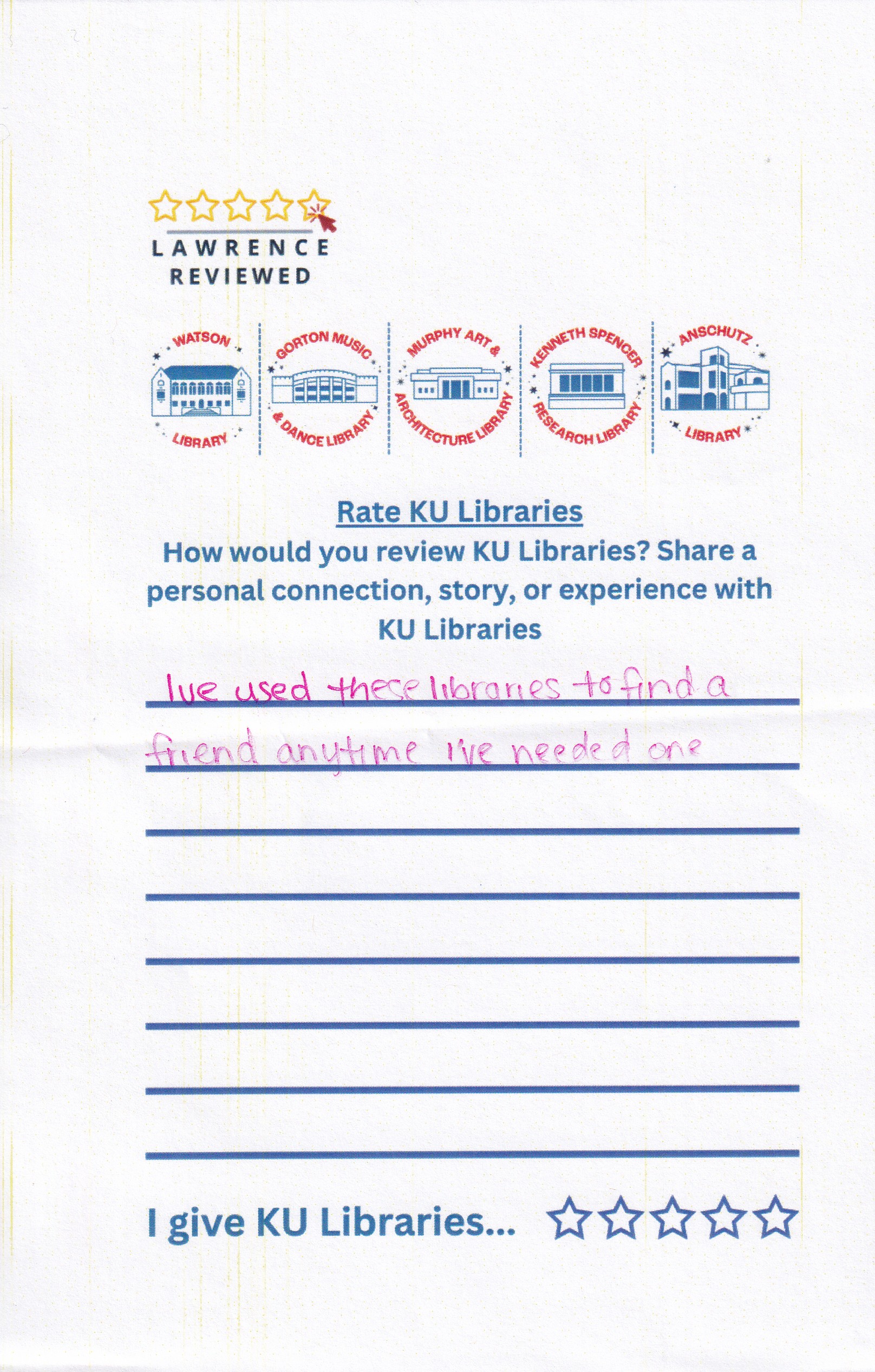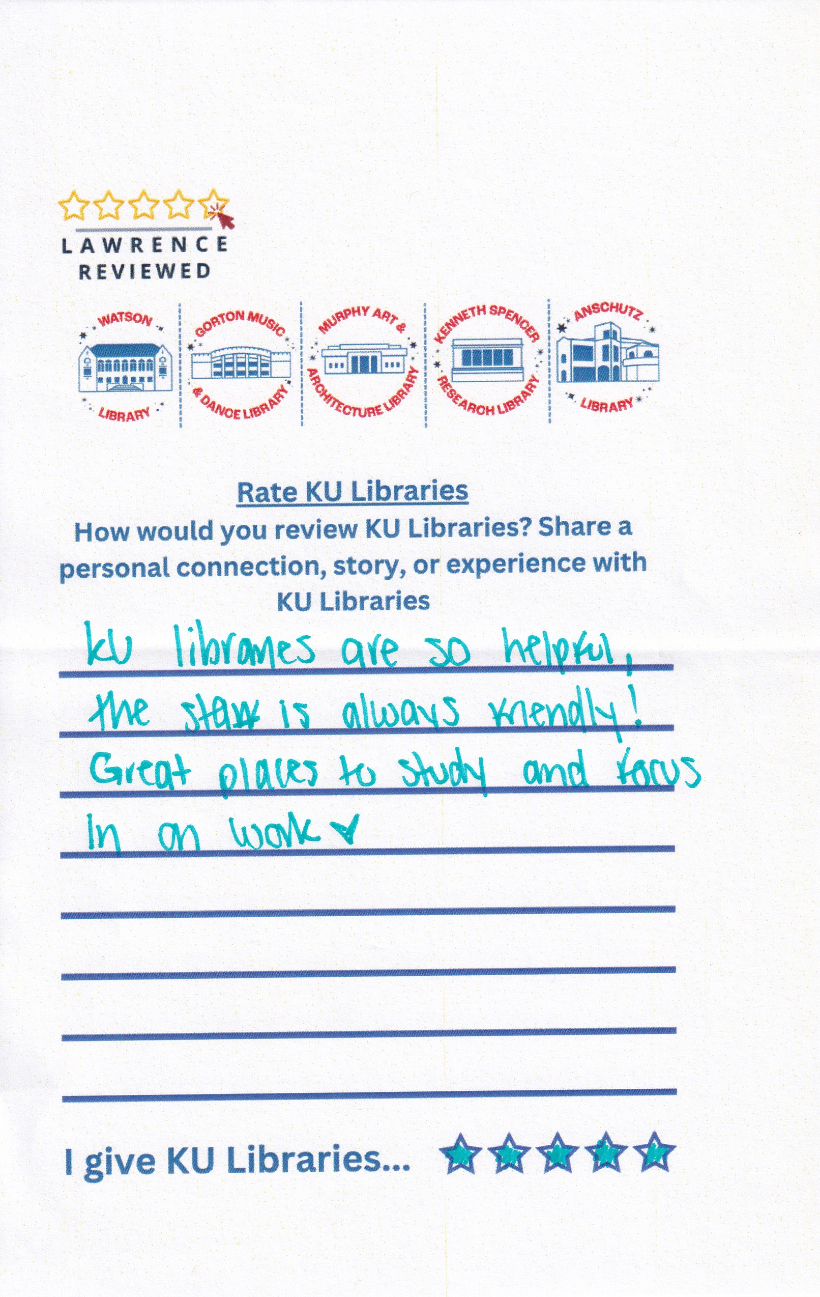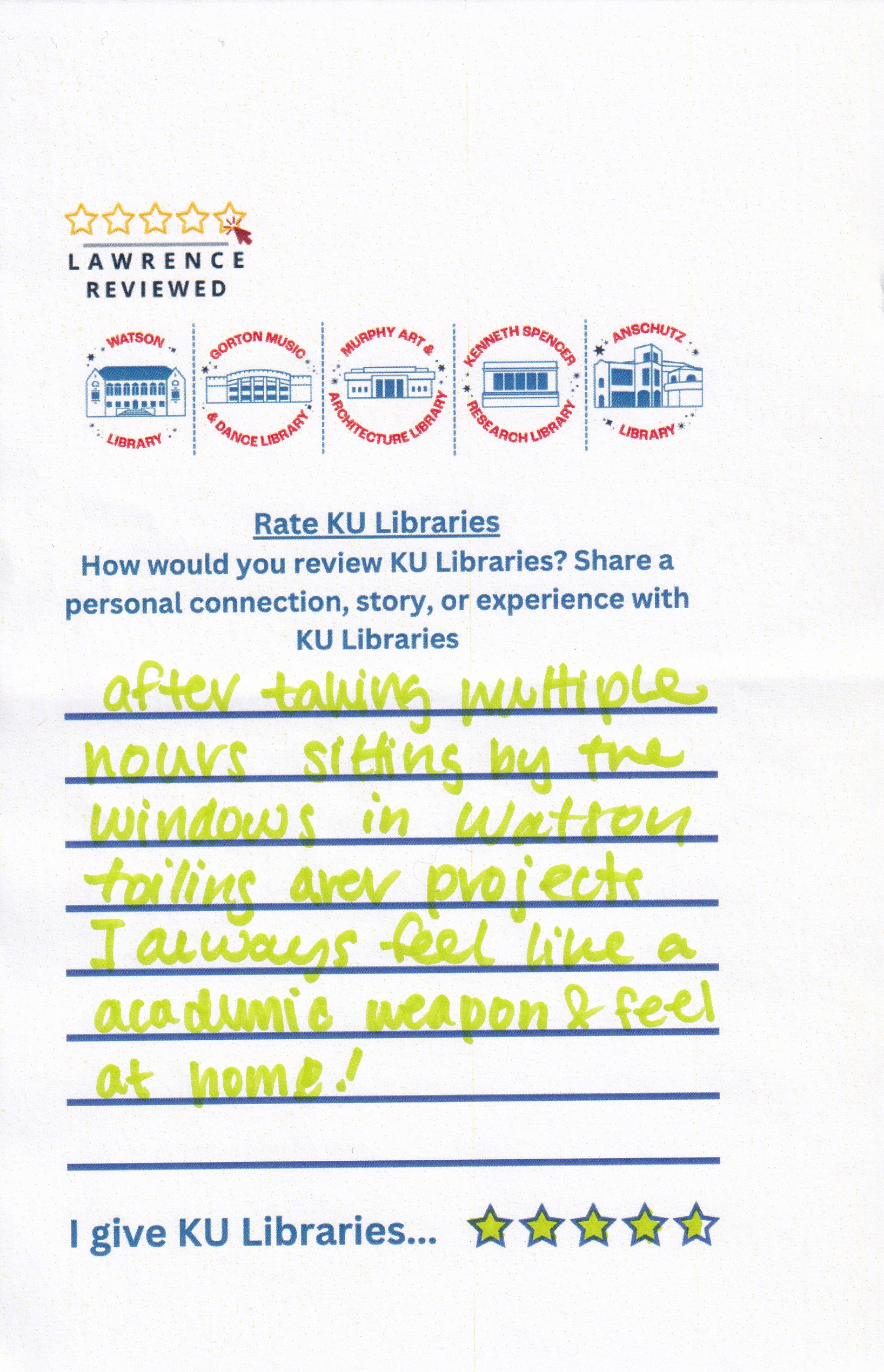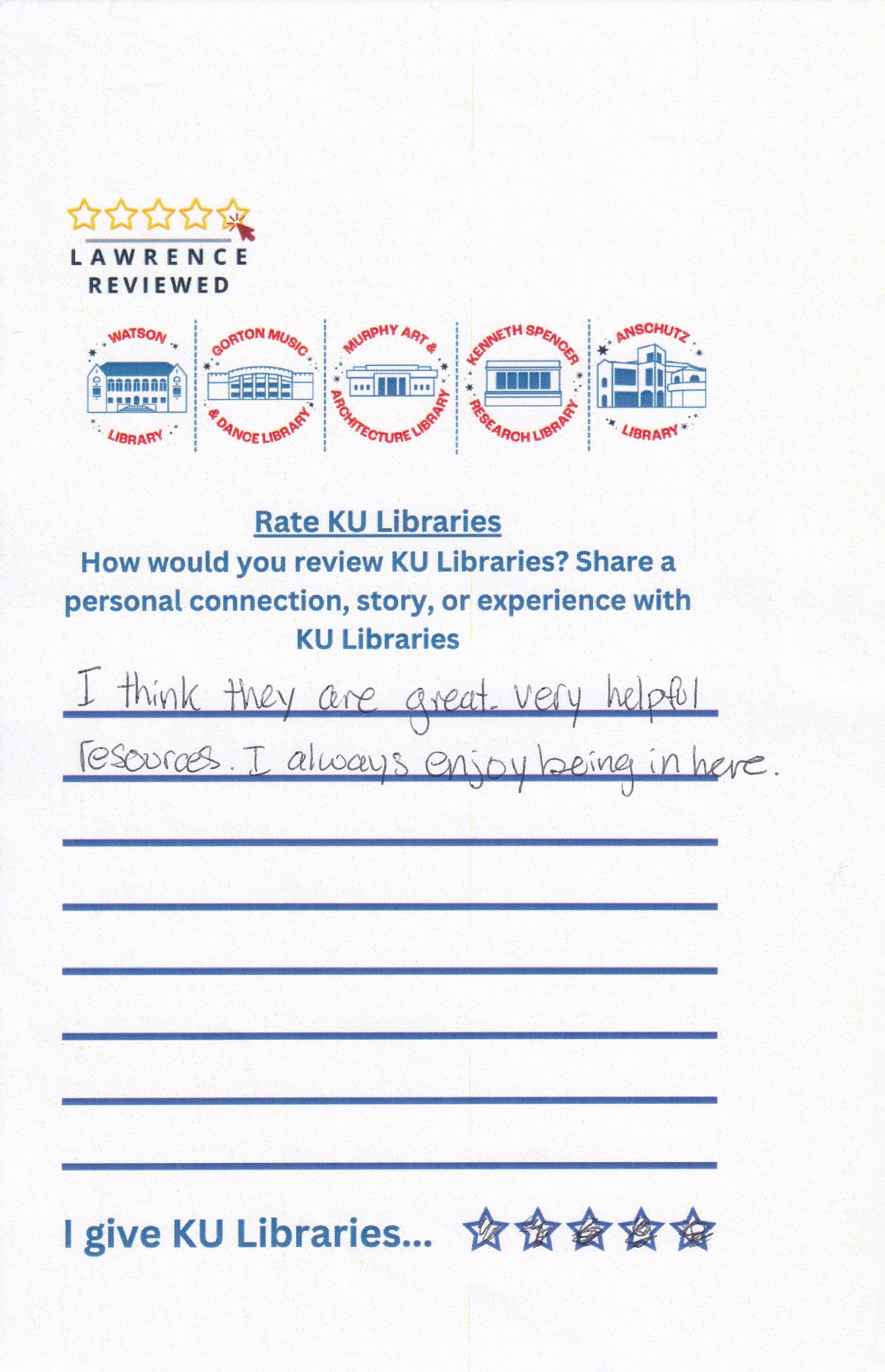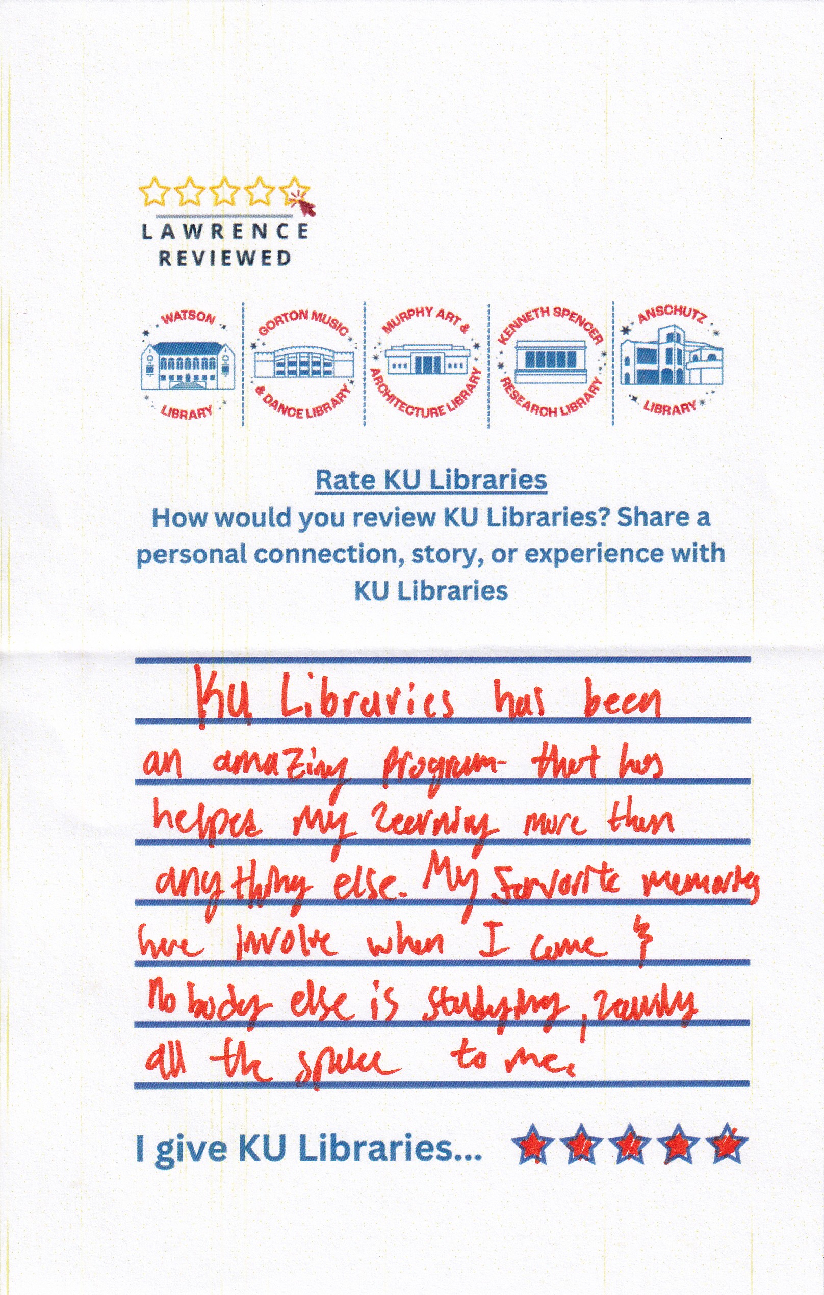Prompt: How would you review KU Libraries? Share a personal connection, story, or experience with KU Libraries.