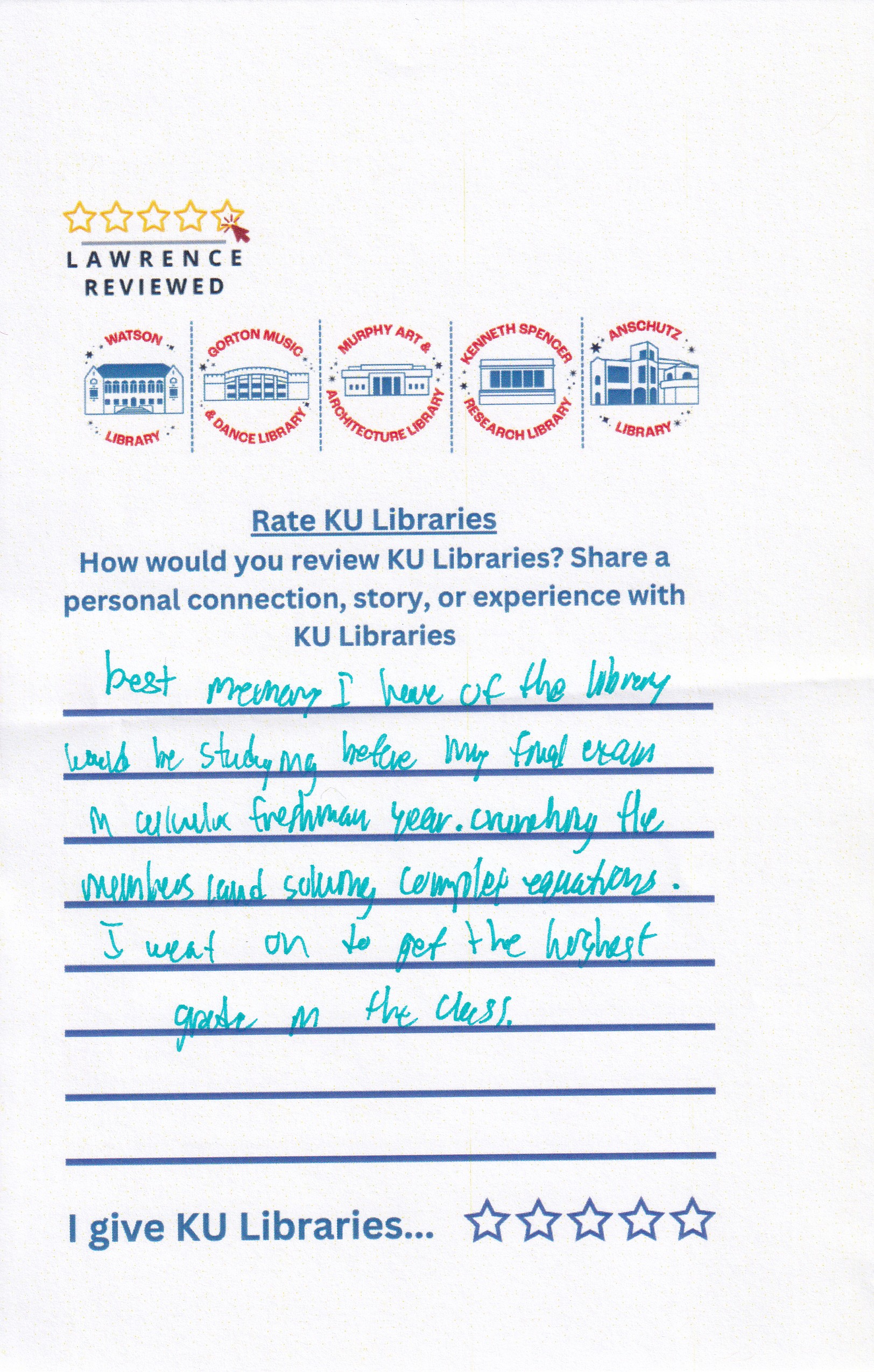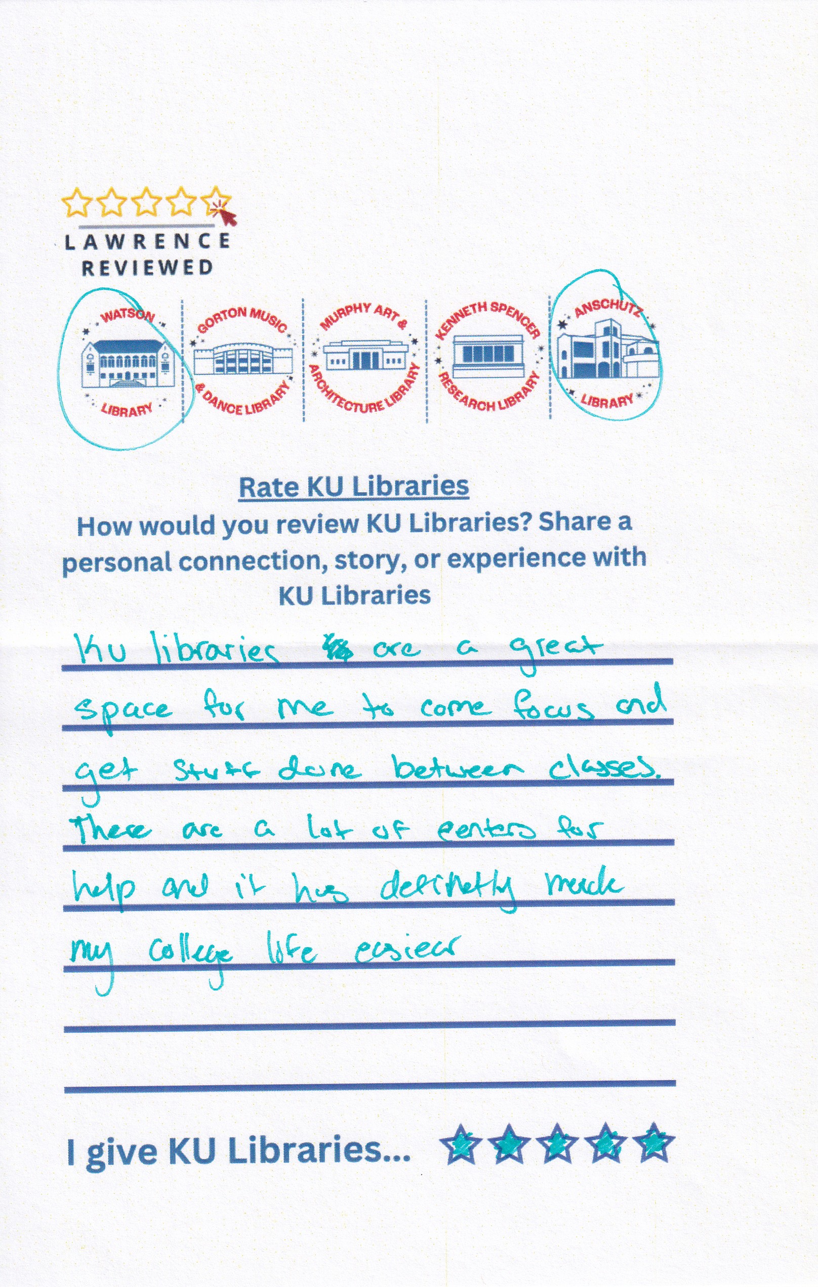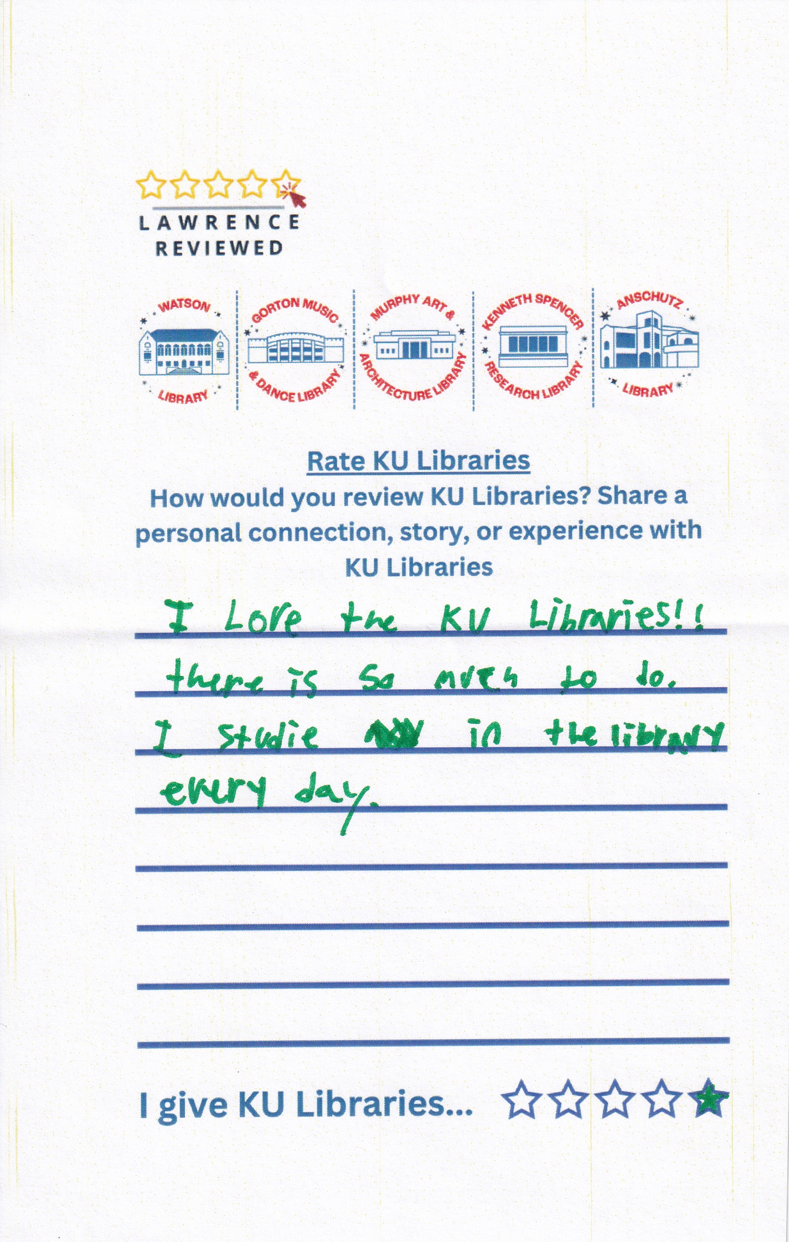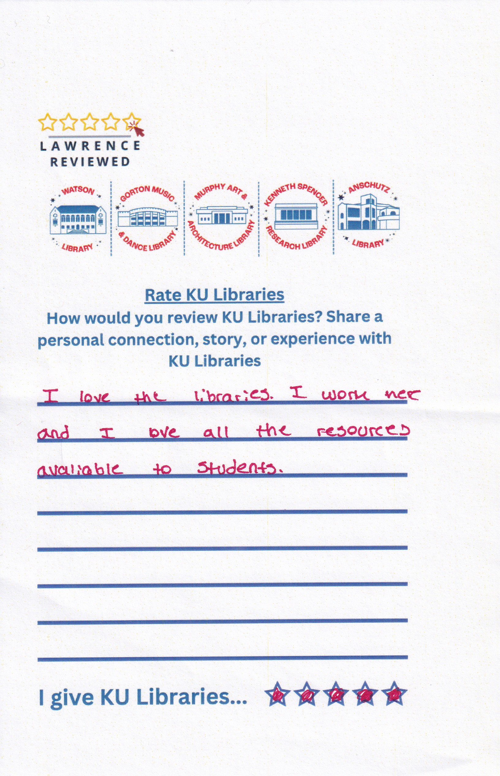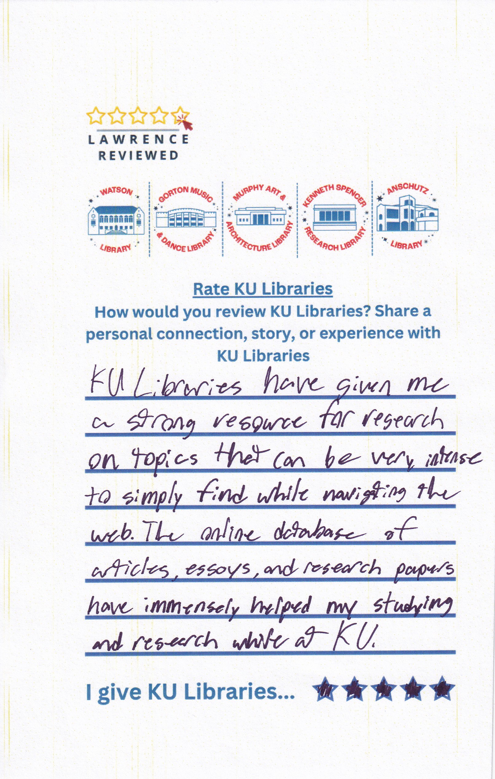 Prompt: How would you review KU Libraries? Share a personal connection, story, or experience with KU Libraries.