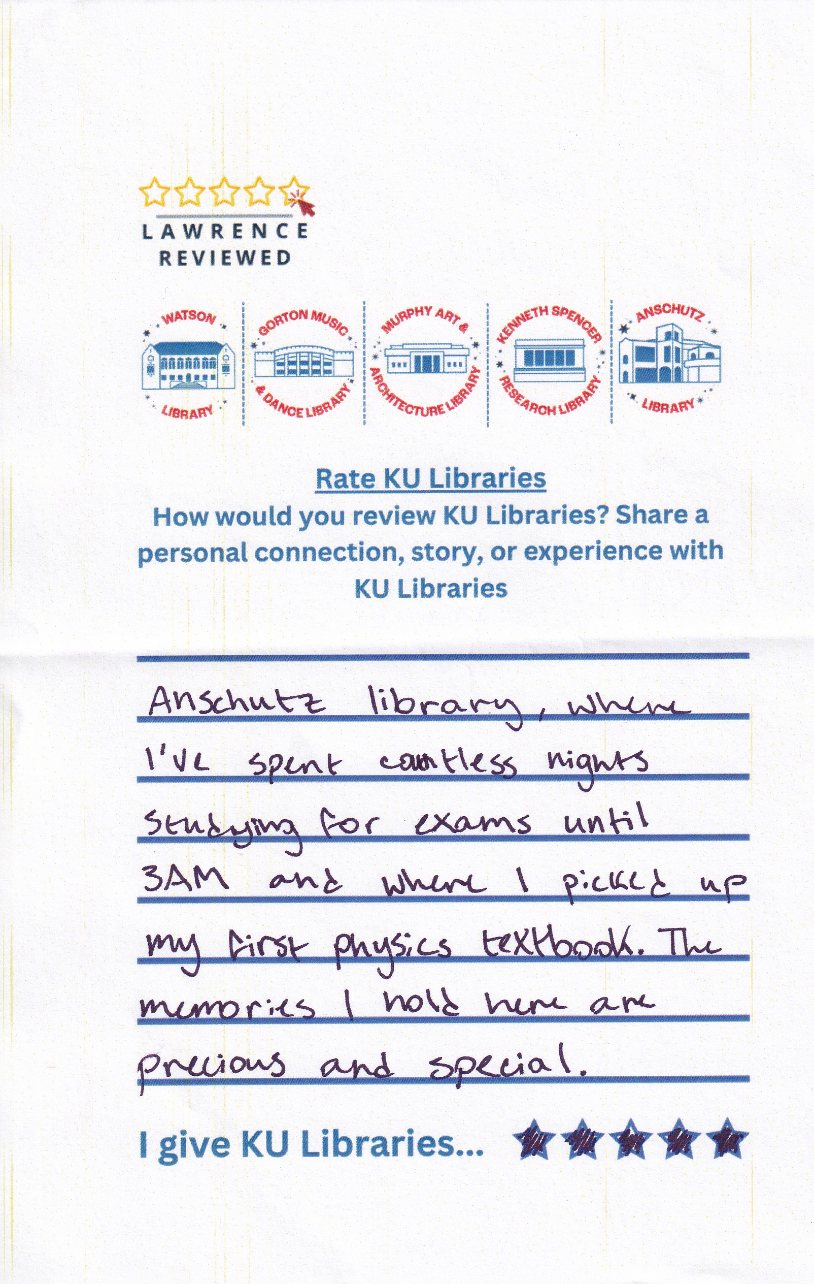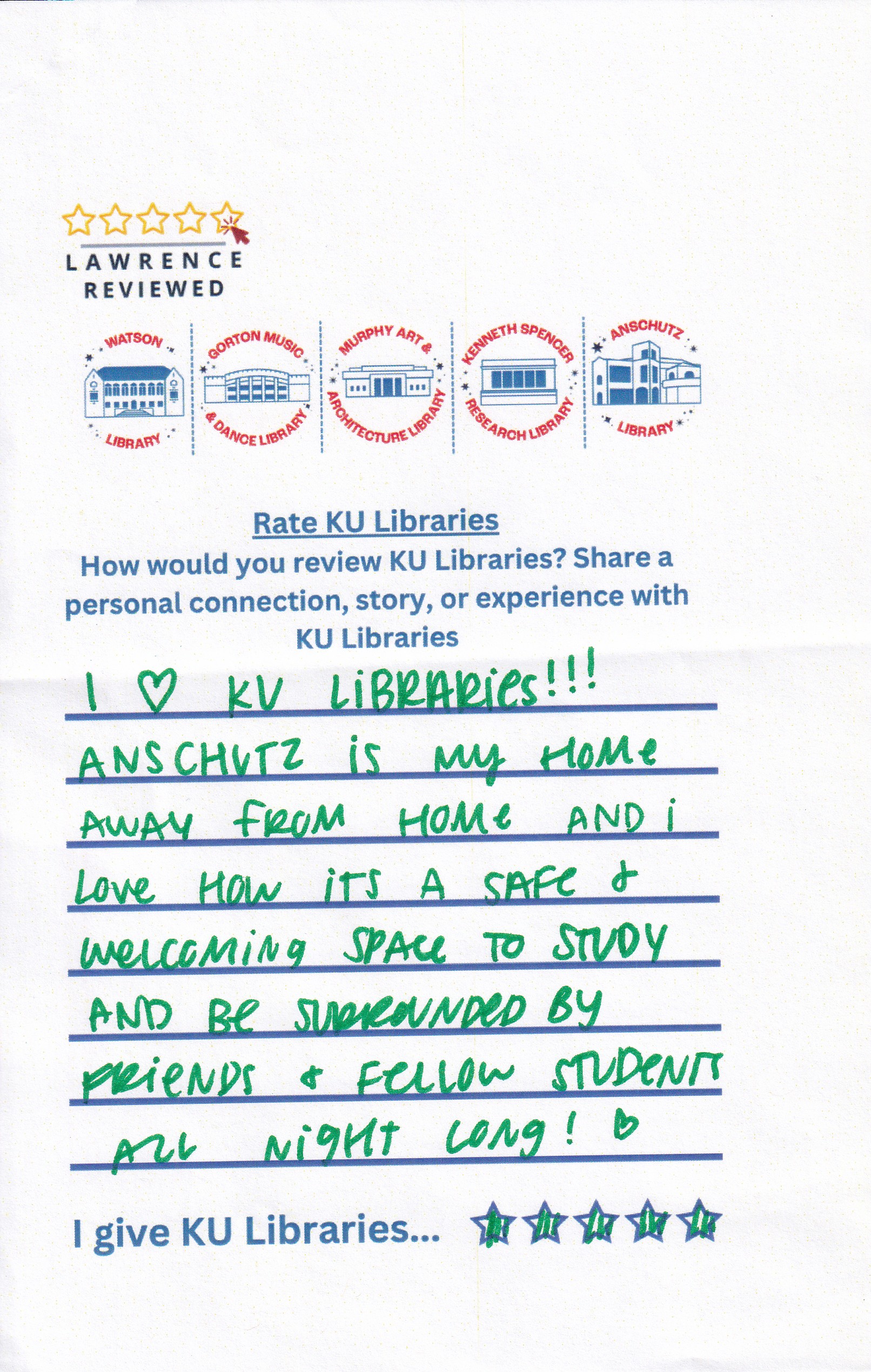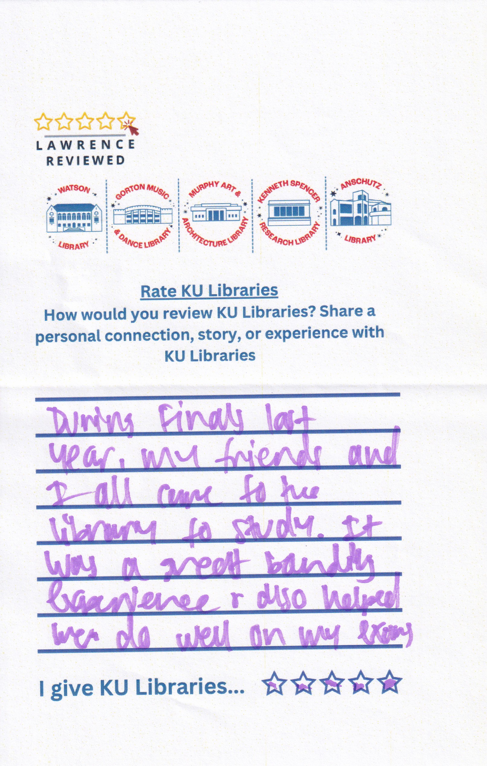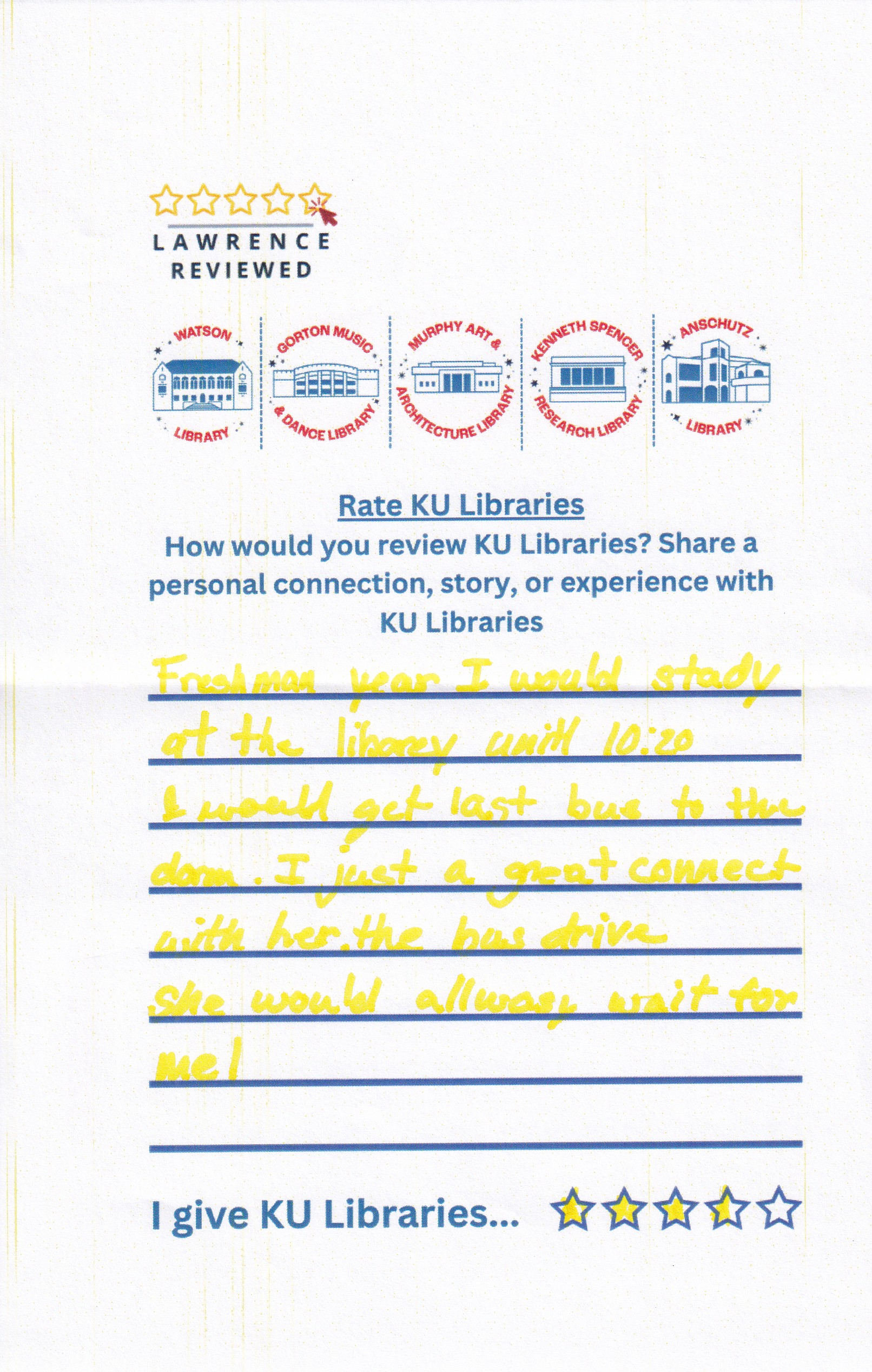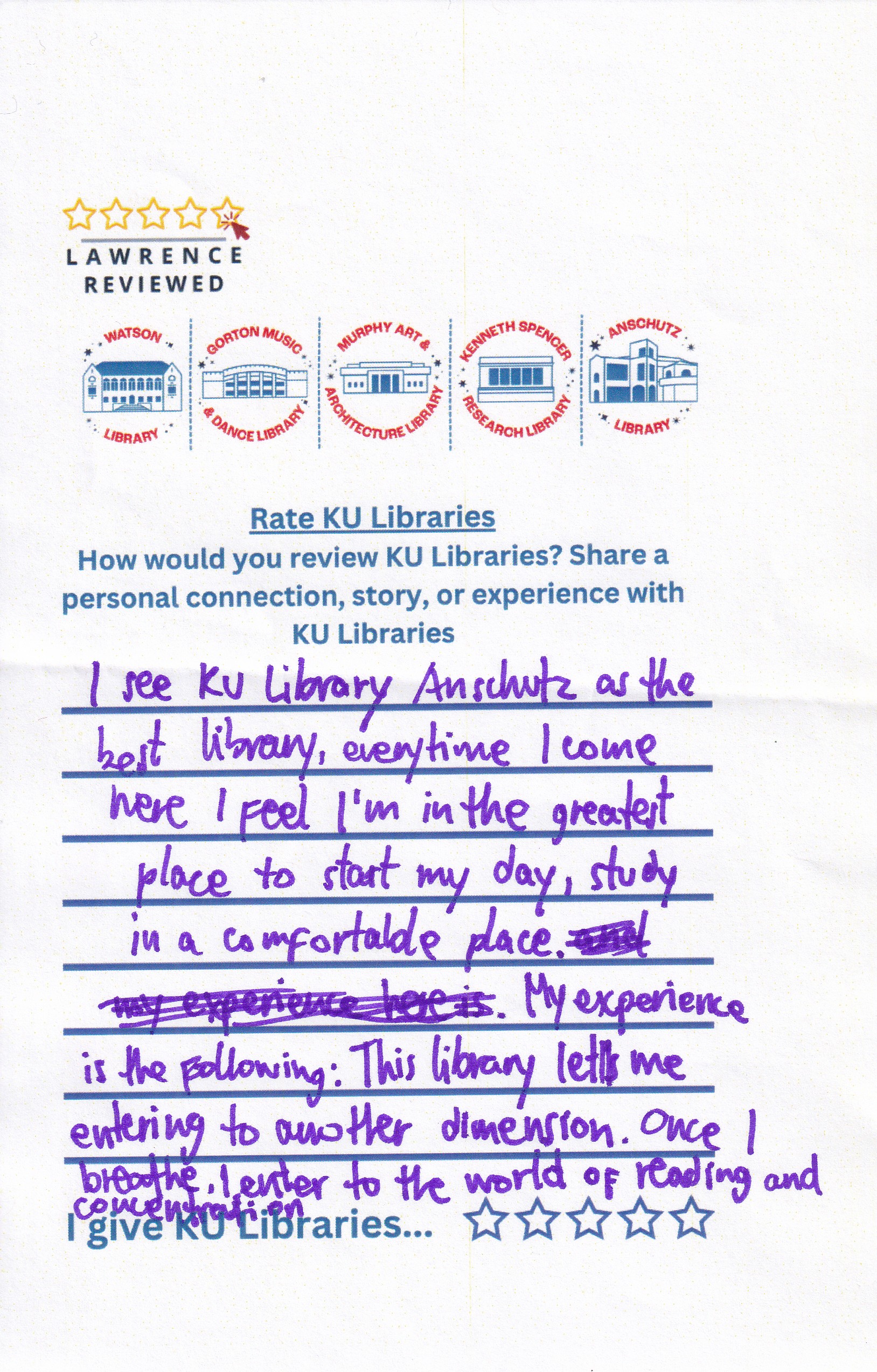 Prompt: How would you review KU Libraries? Share a personal connection, story, or experience with KU Libraries.