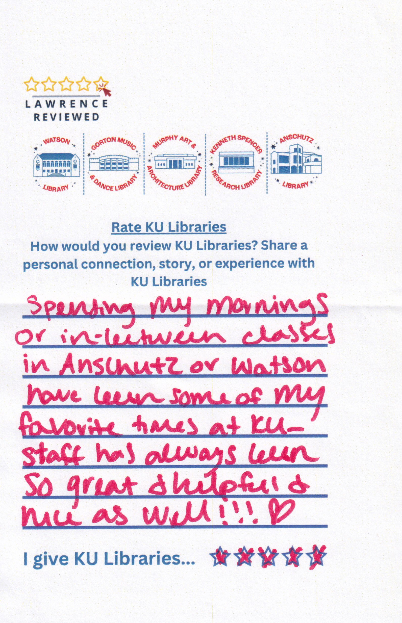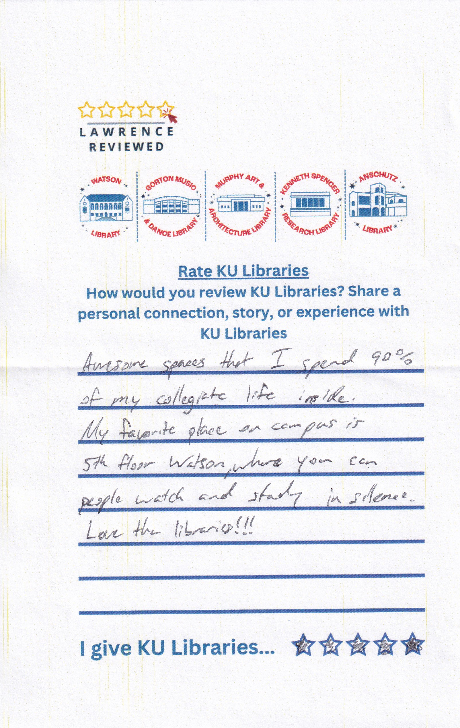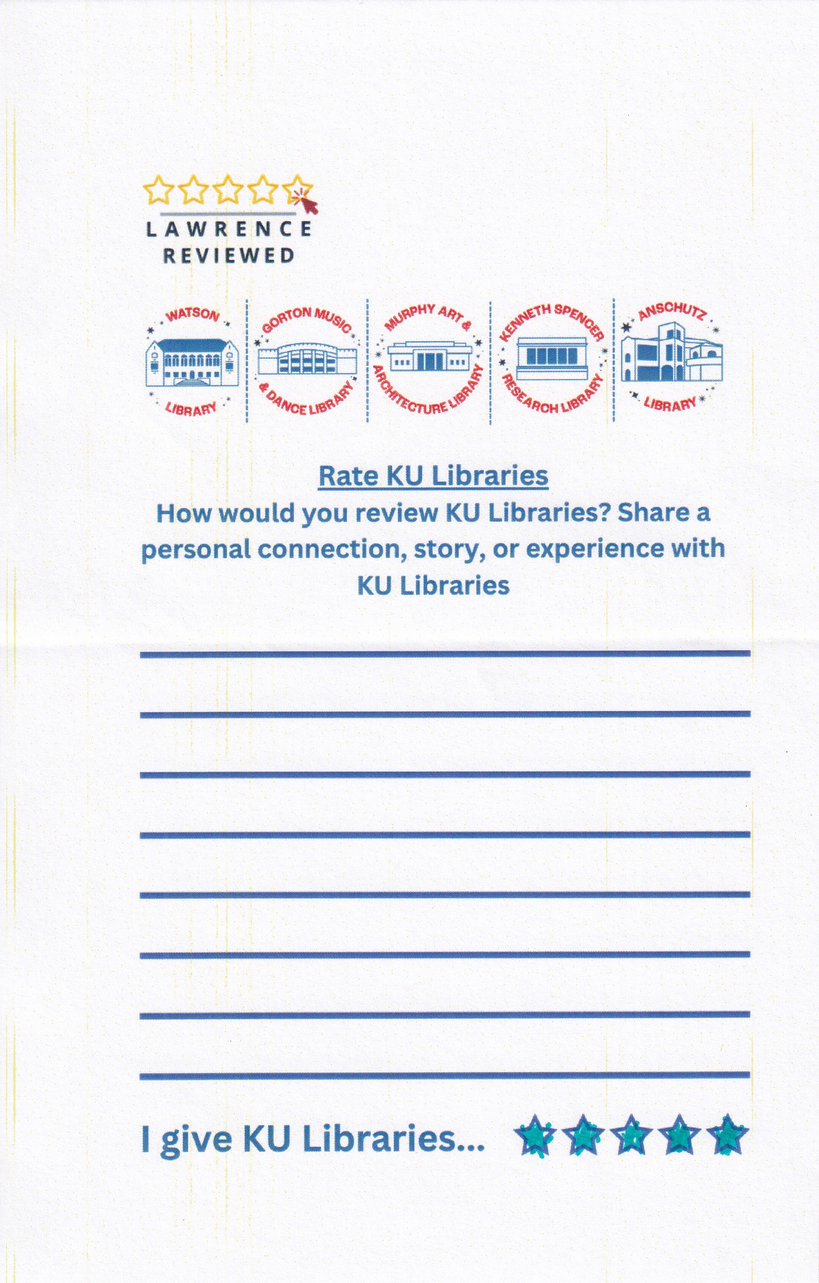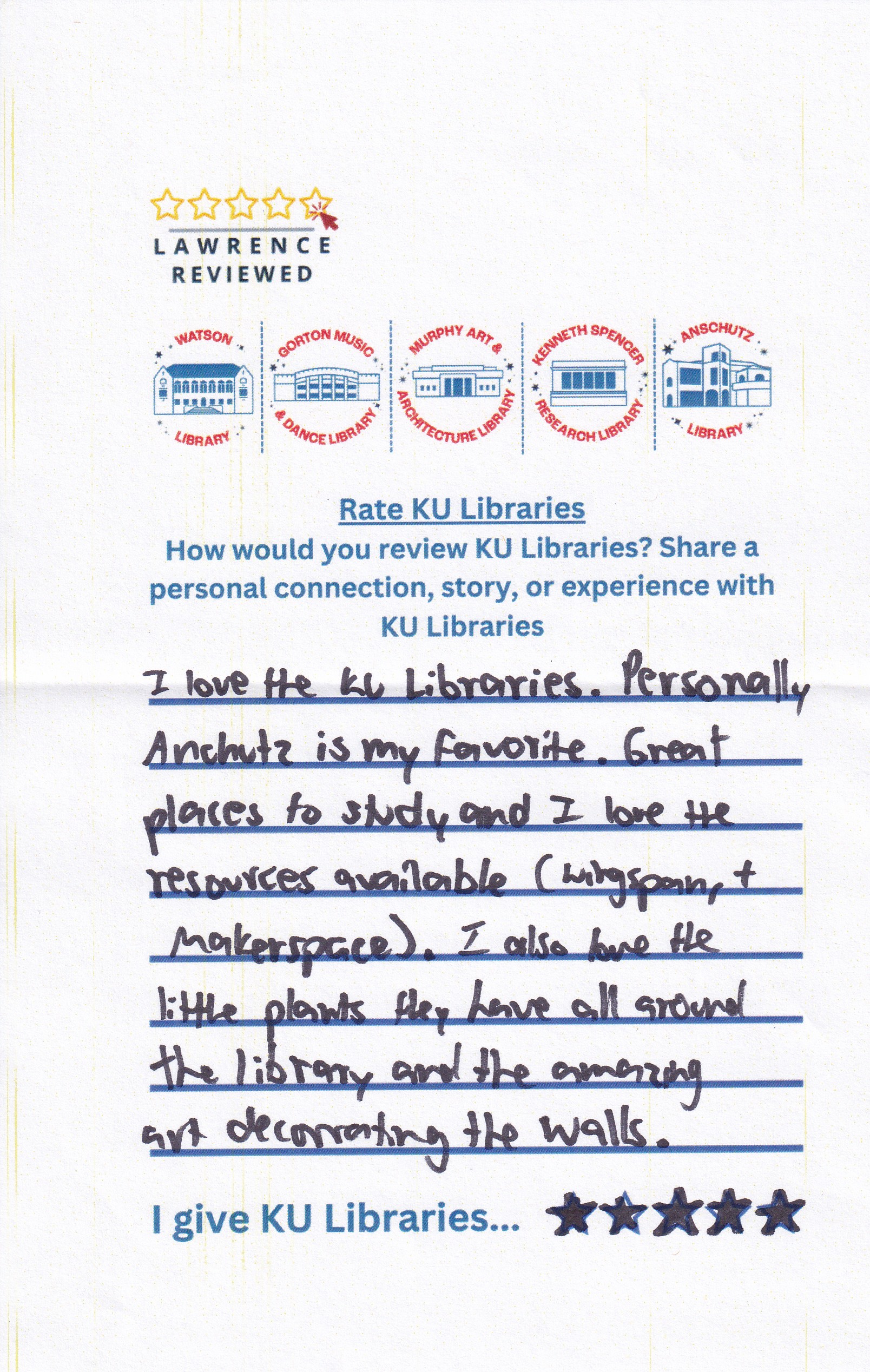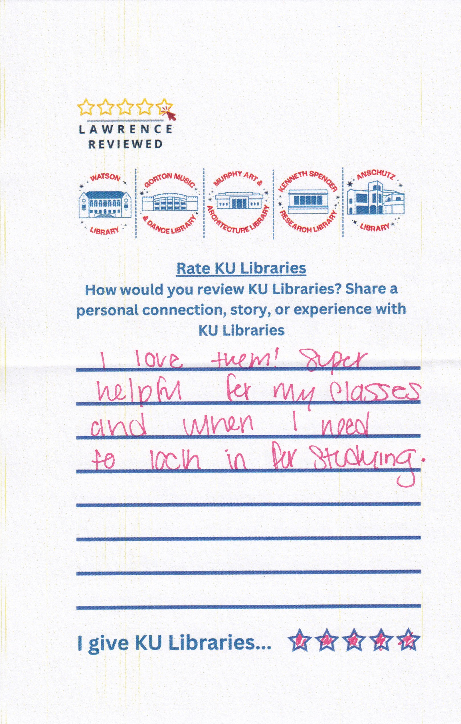 Prompt: How would you review KU Libraries? Share a personal connection, story, or experience with KU Libraries.