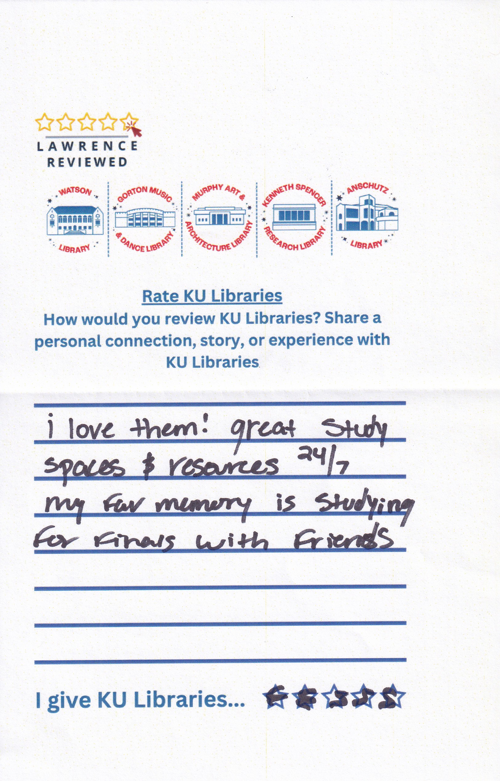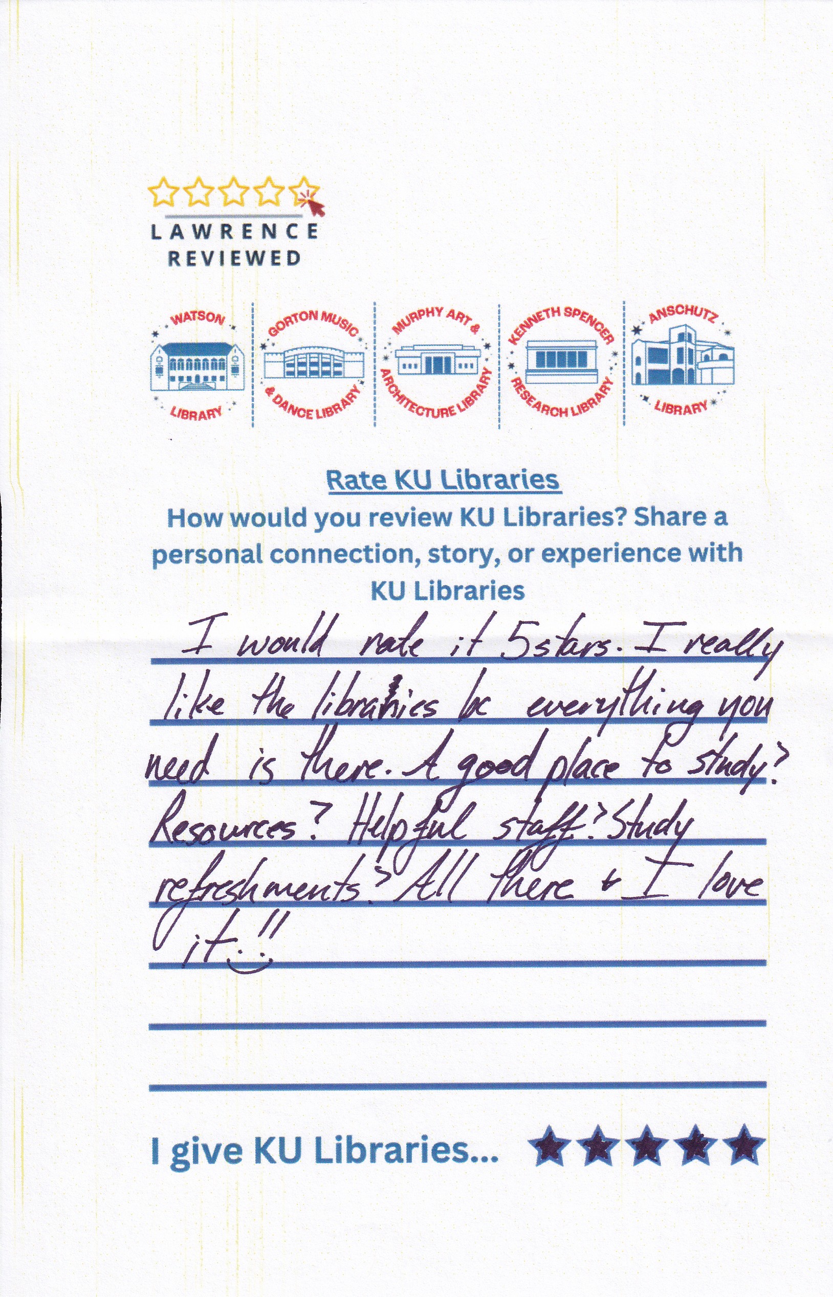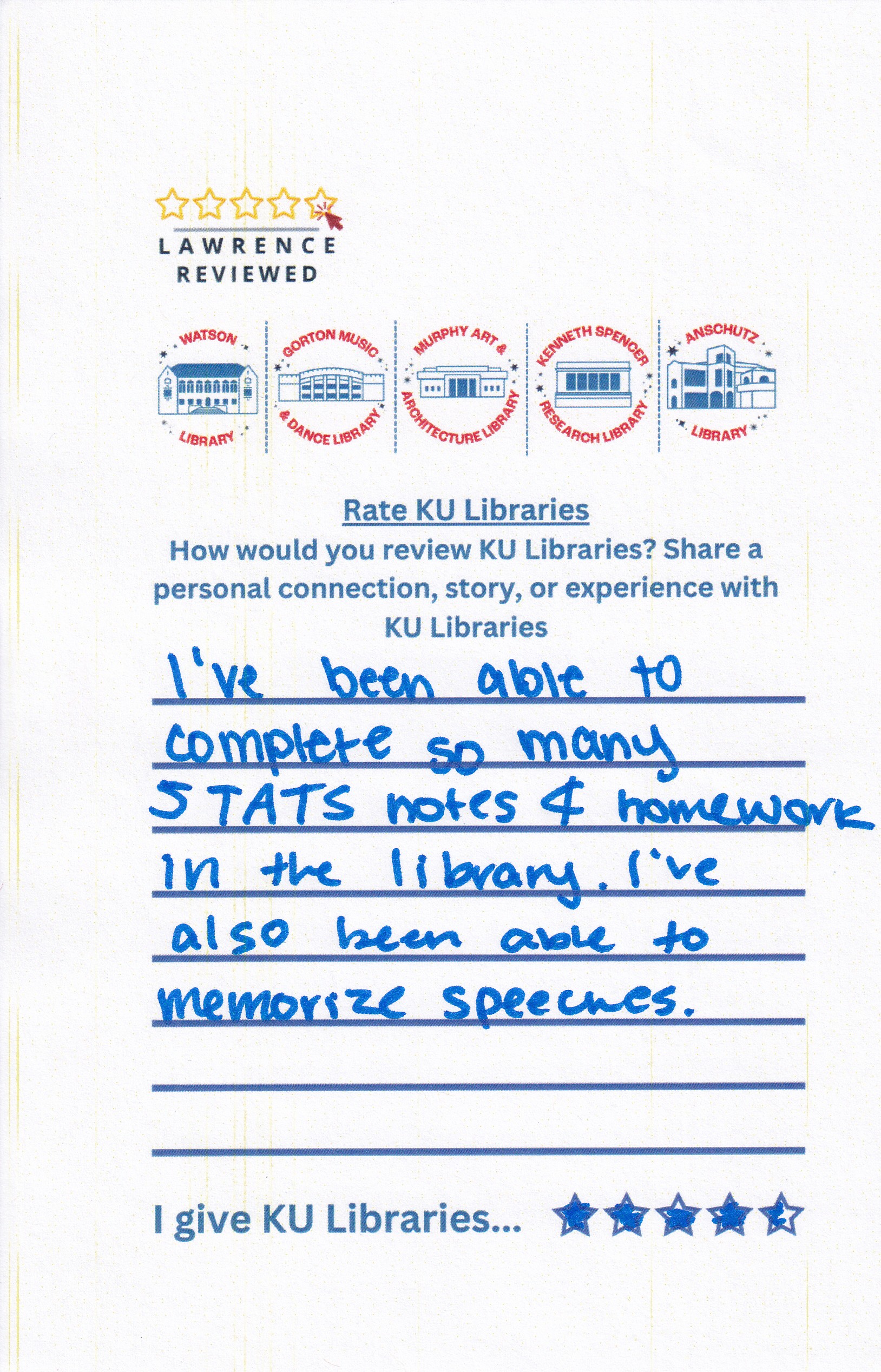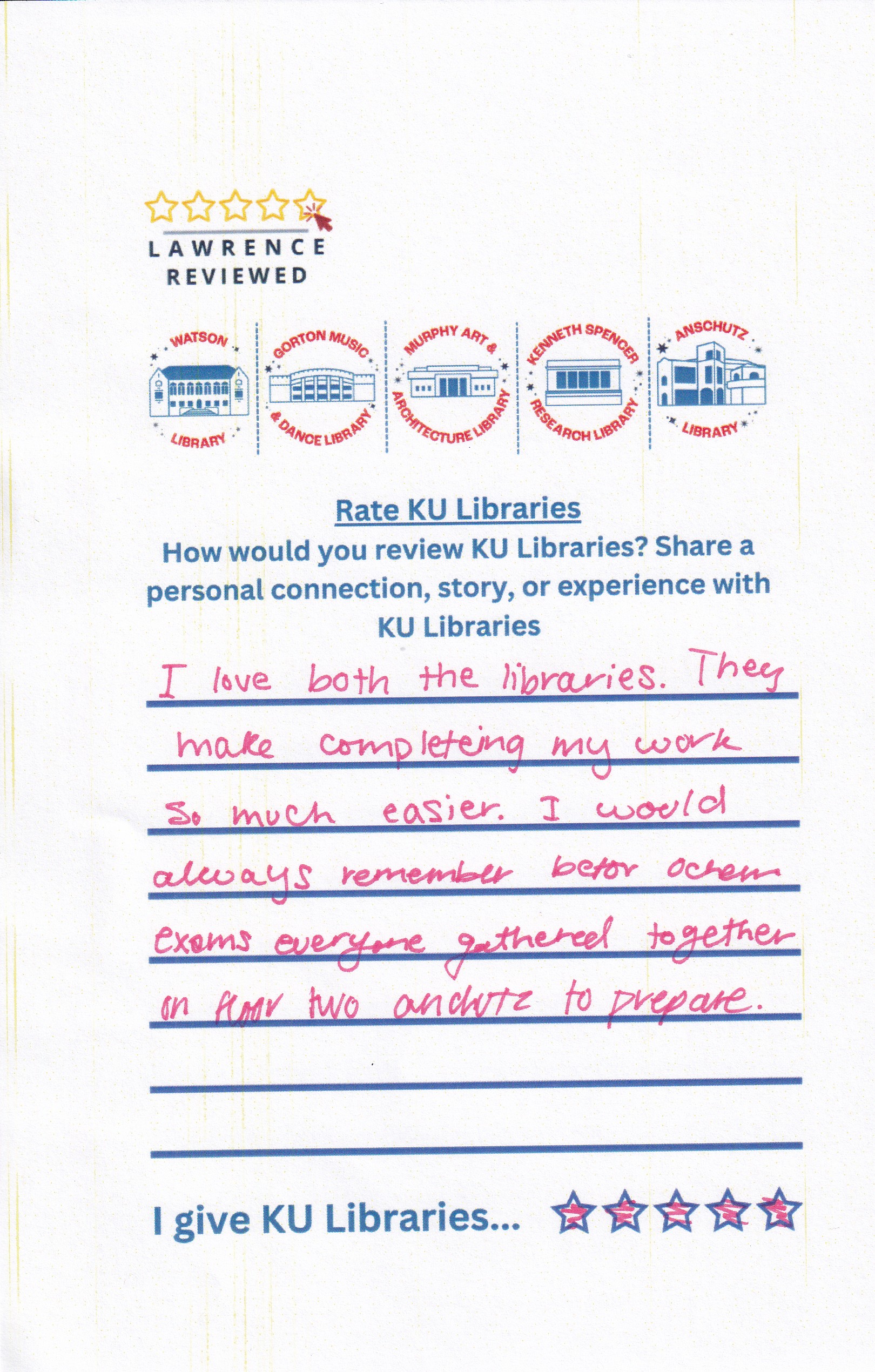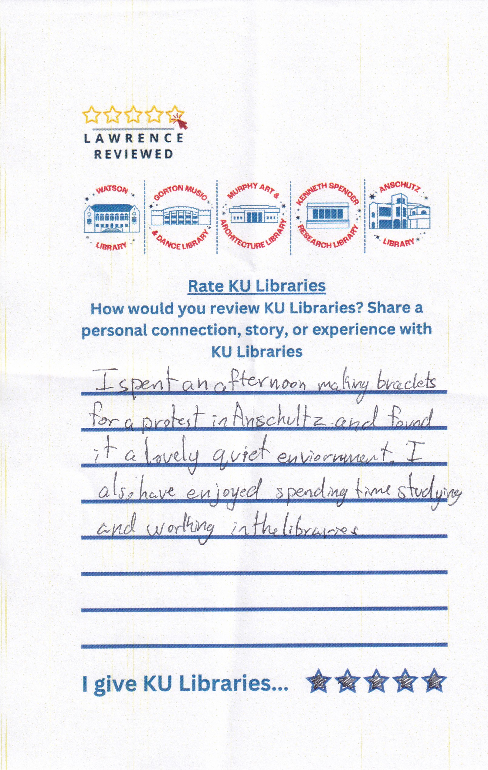 Prompt: How would you review KU Libraries? Share a personal connection, story, or experience with KU Libraries.