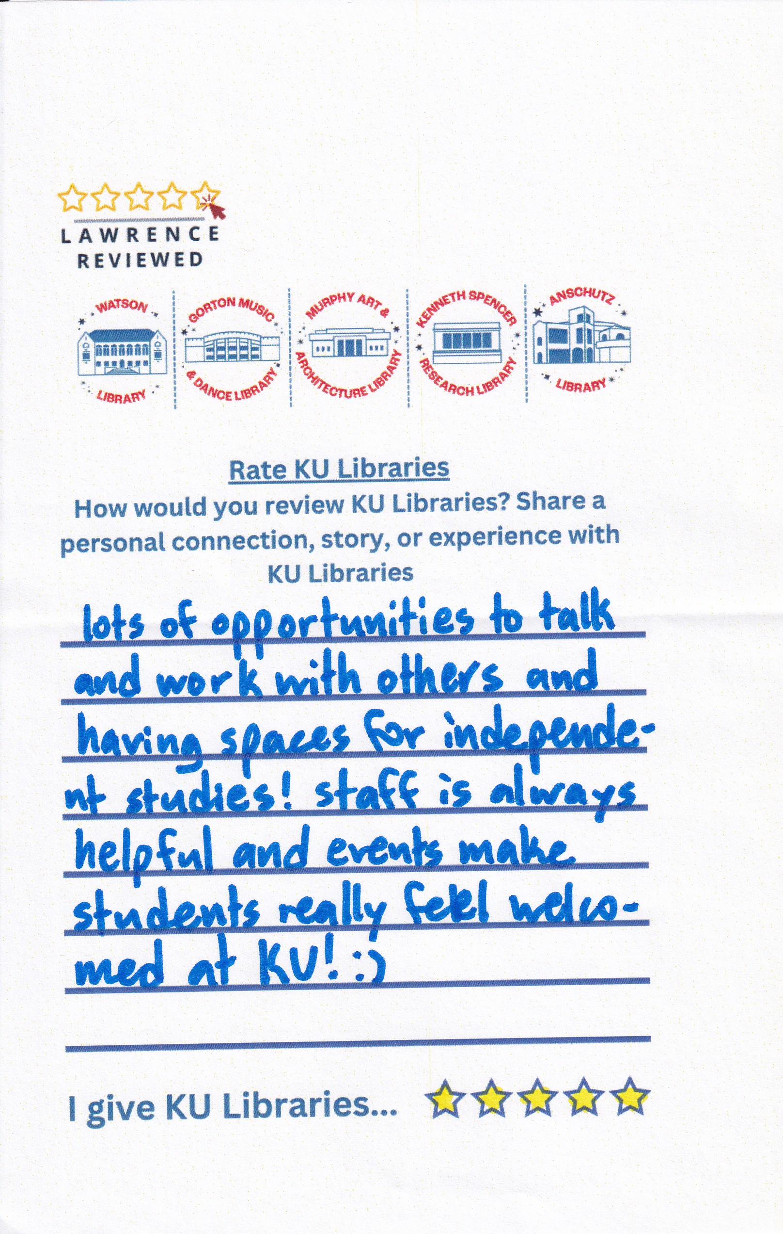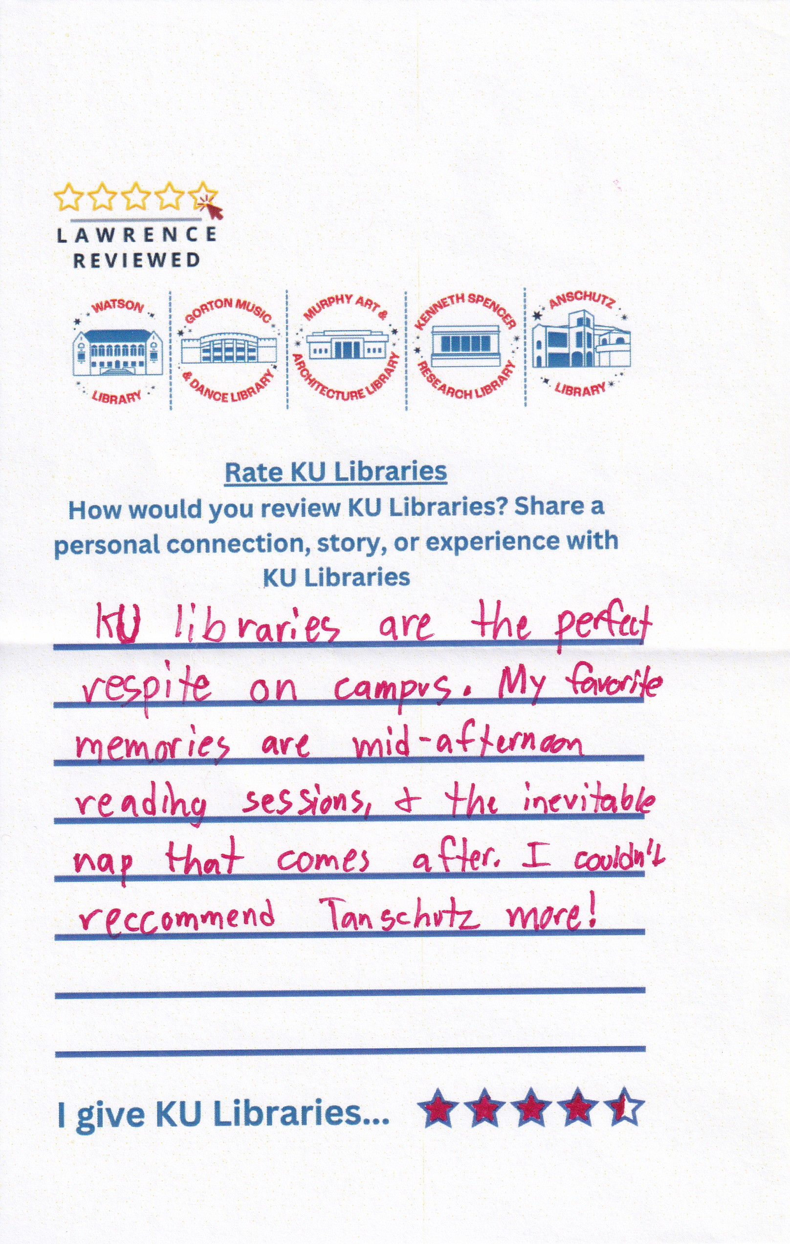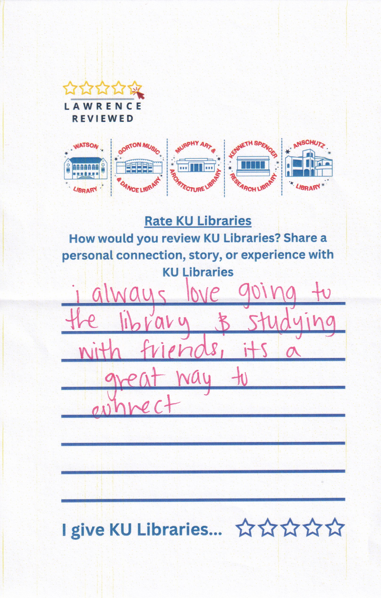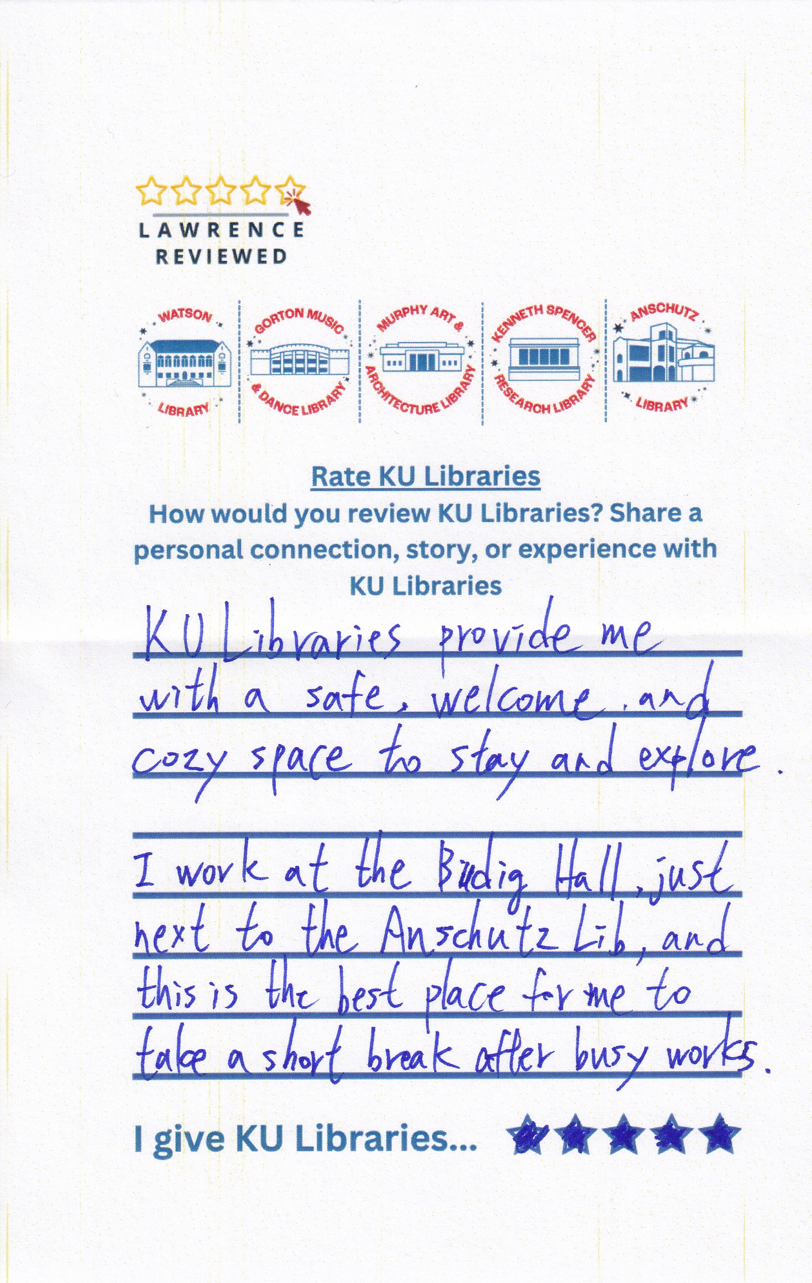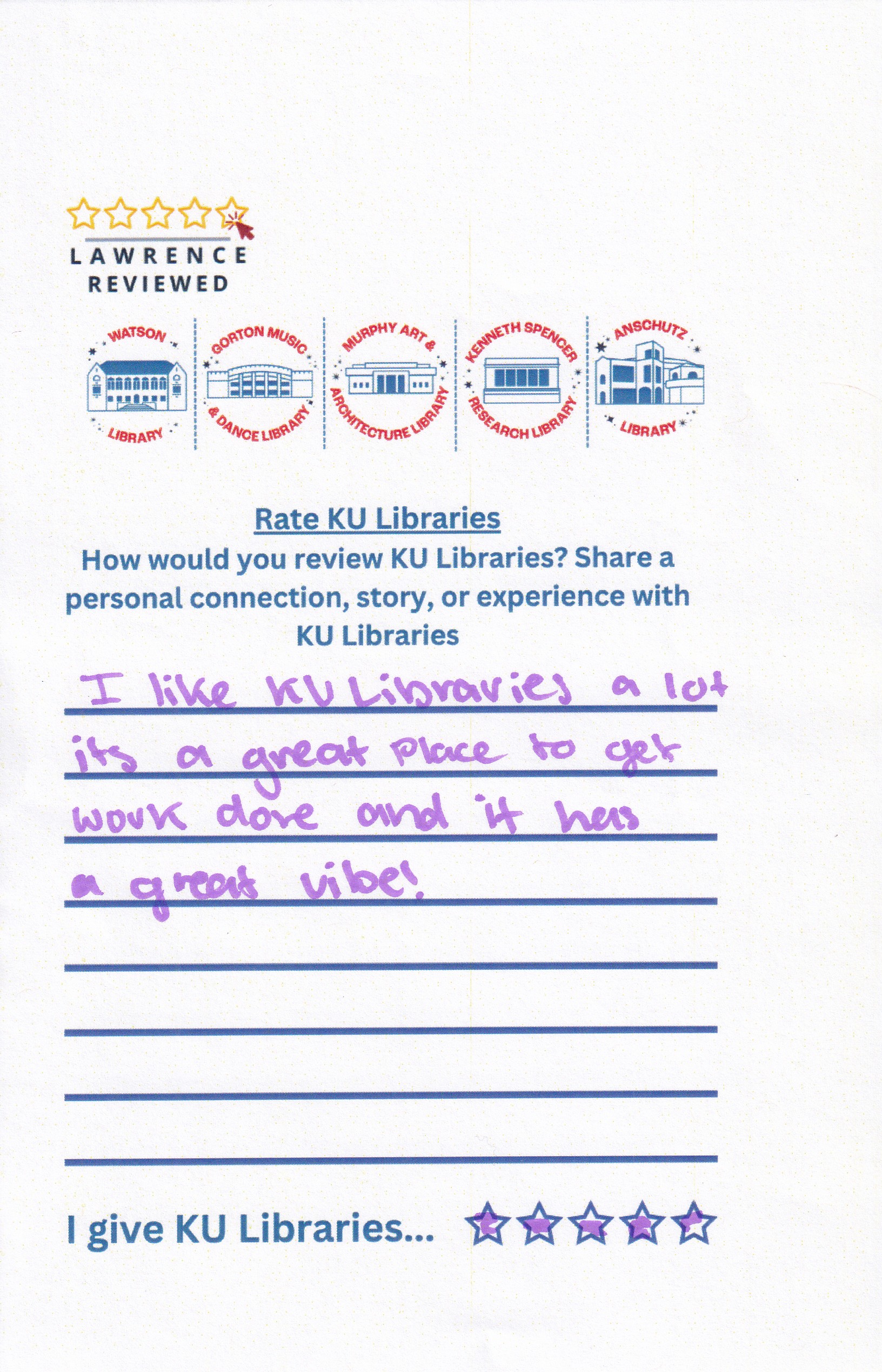 Prompt: How would you review KU Libraries? Share a personal connection, story, or experience with KU Libraries.