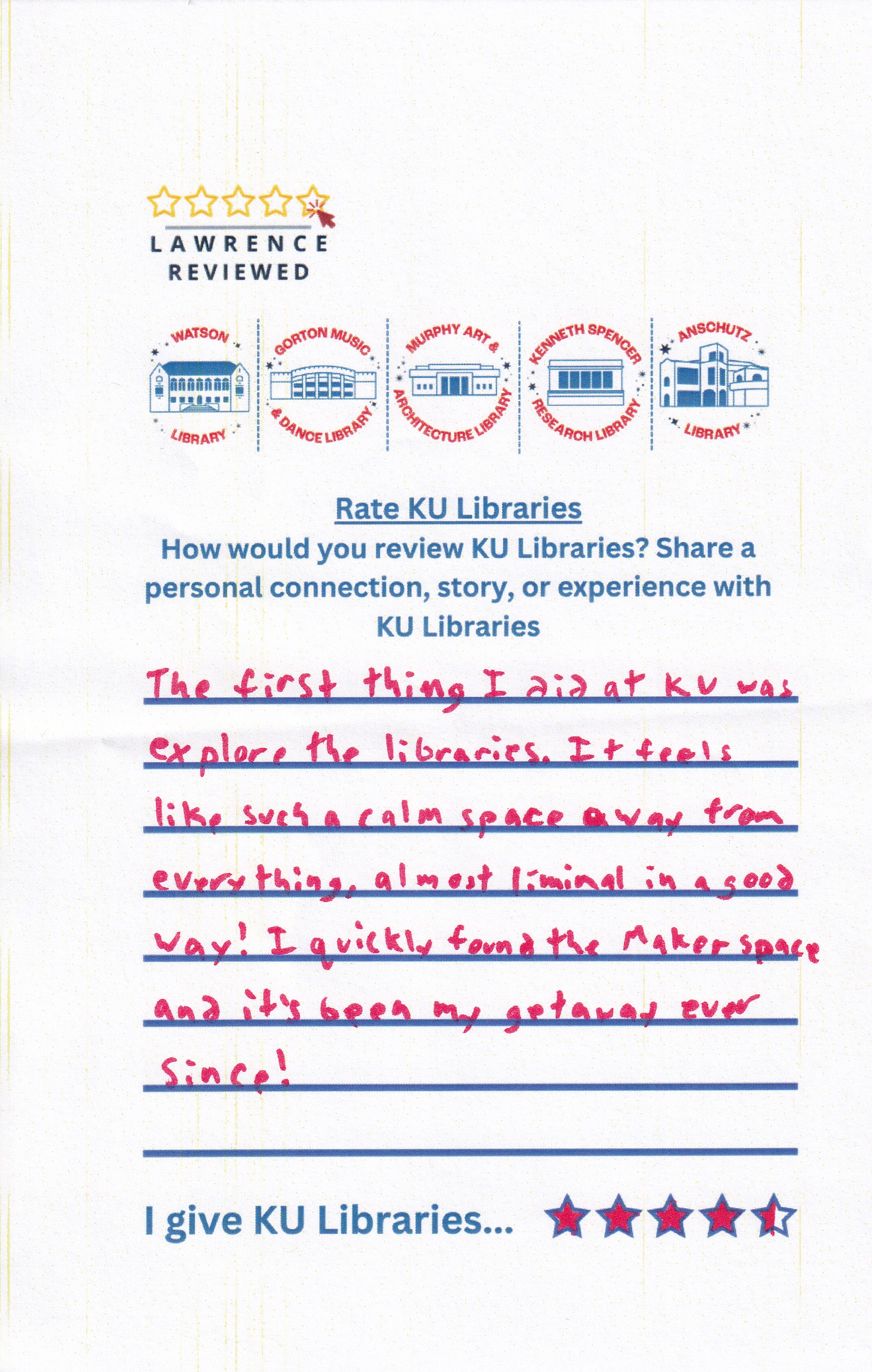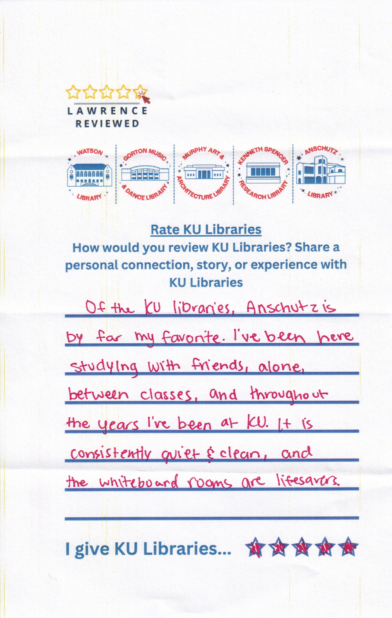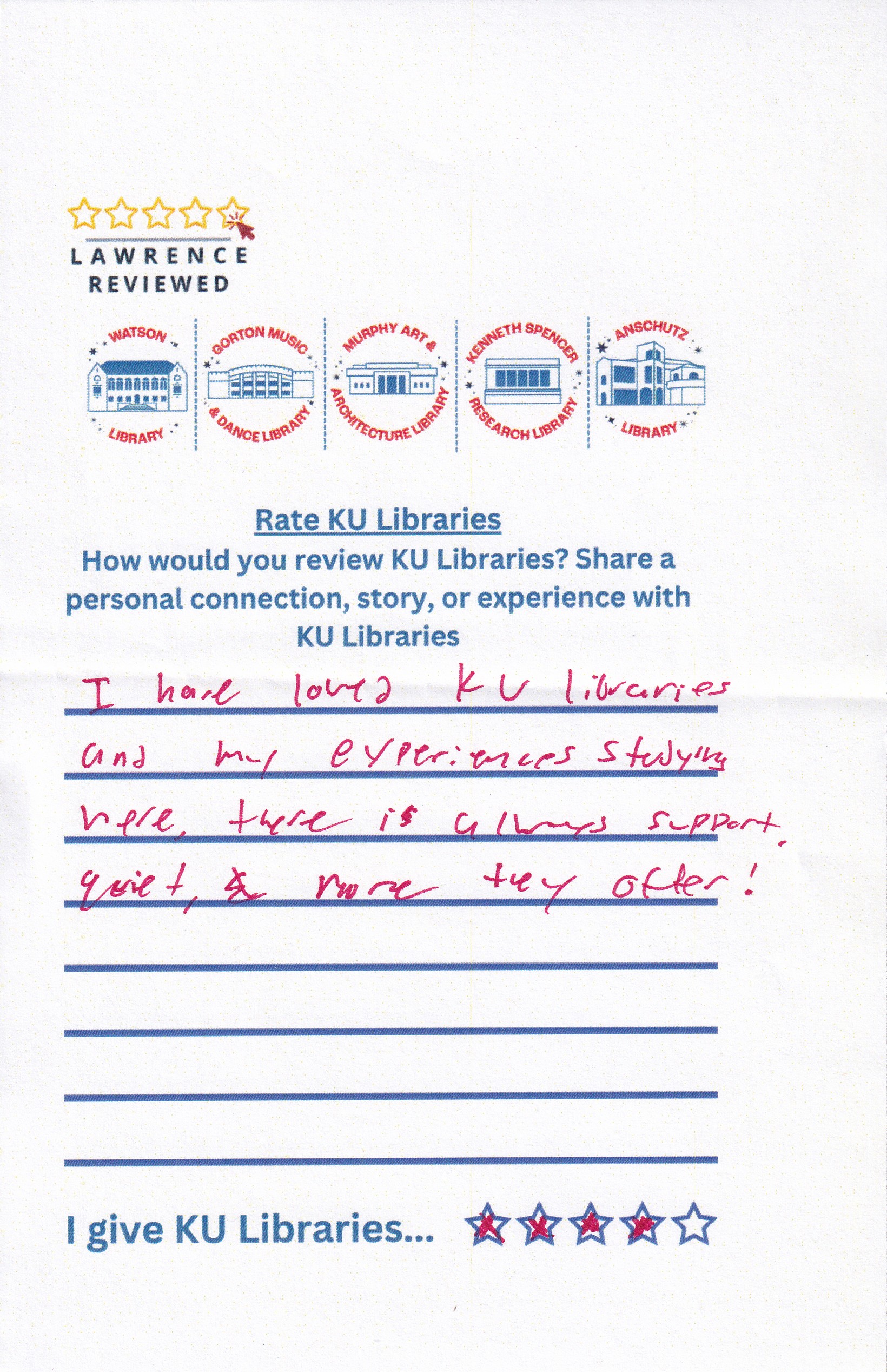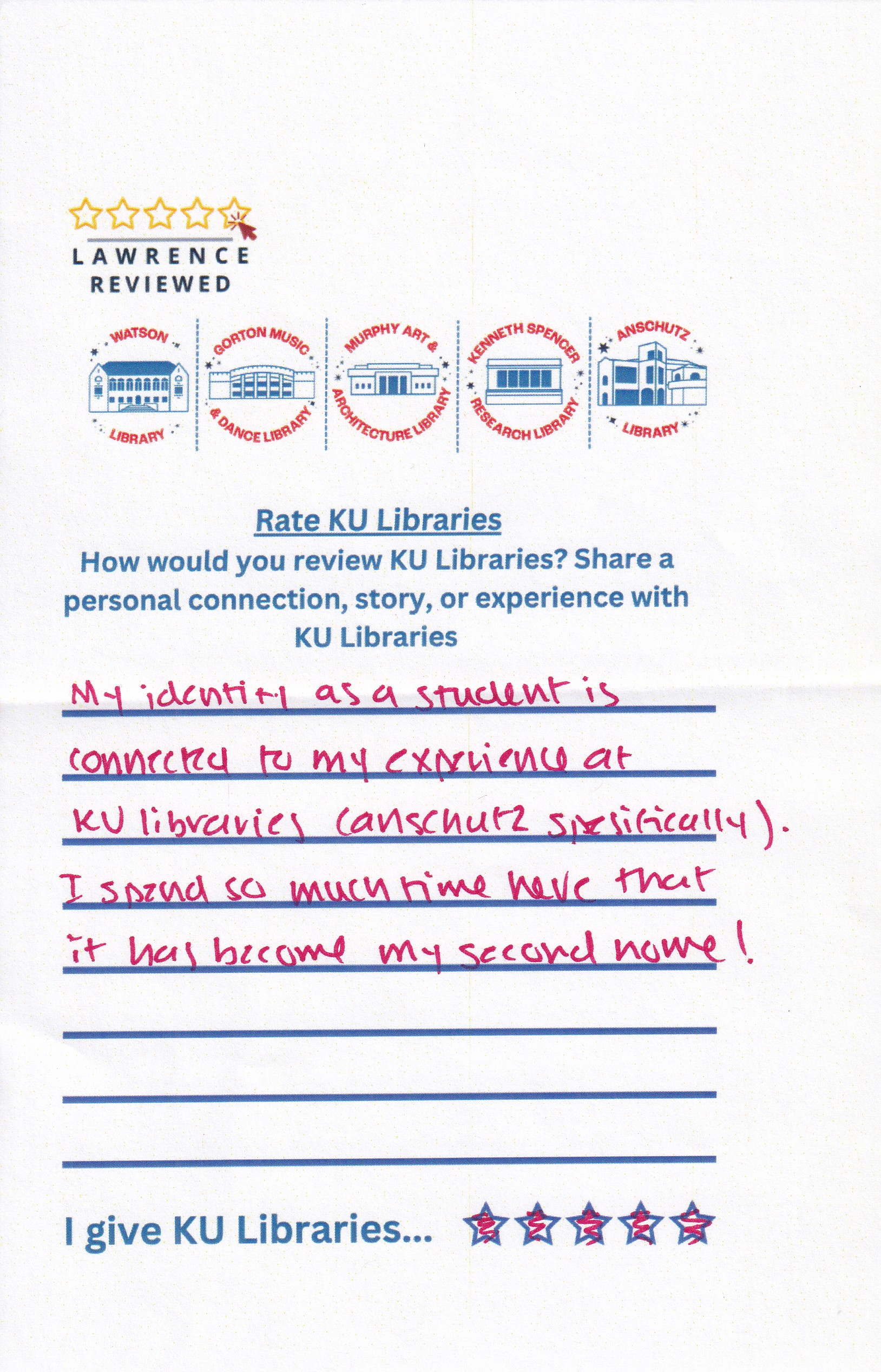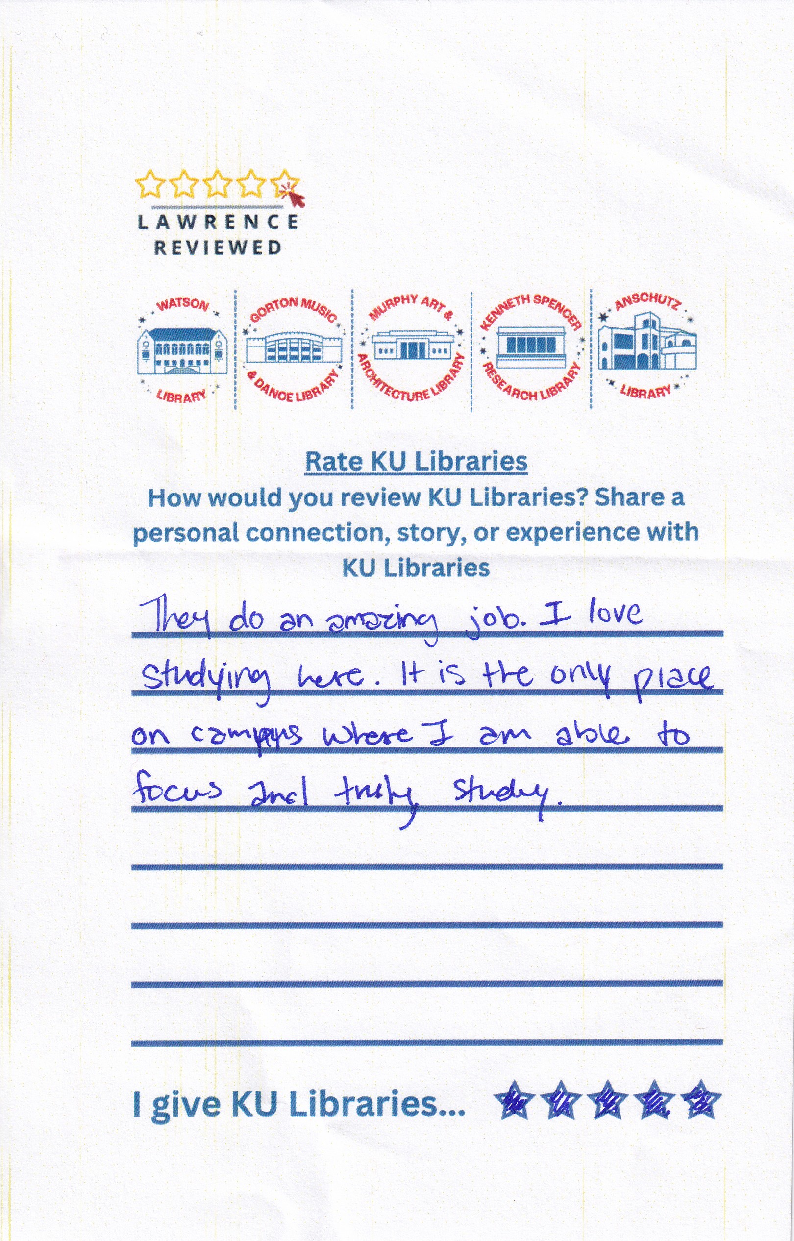 Prompt: How would you review KU Libraries? Share a personal connection, story, or experience with KU Libraries.