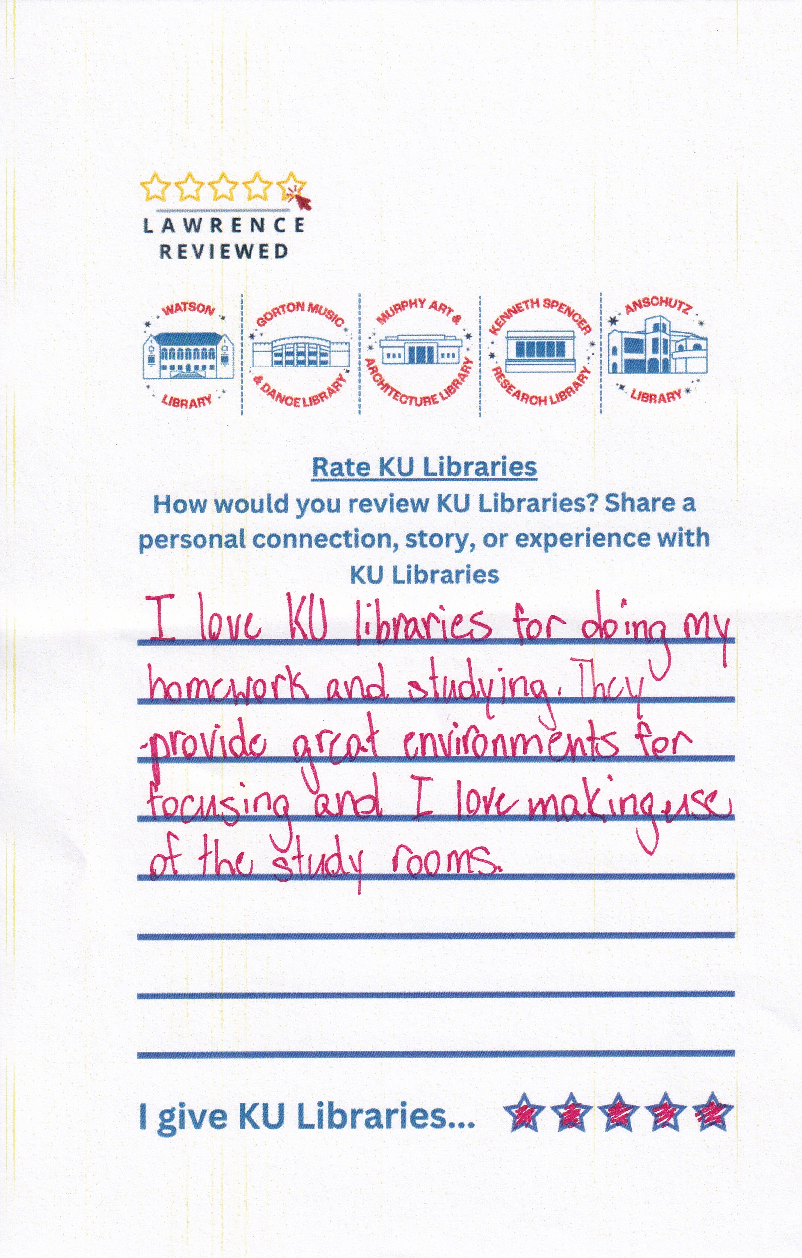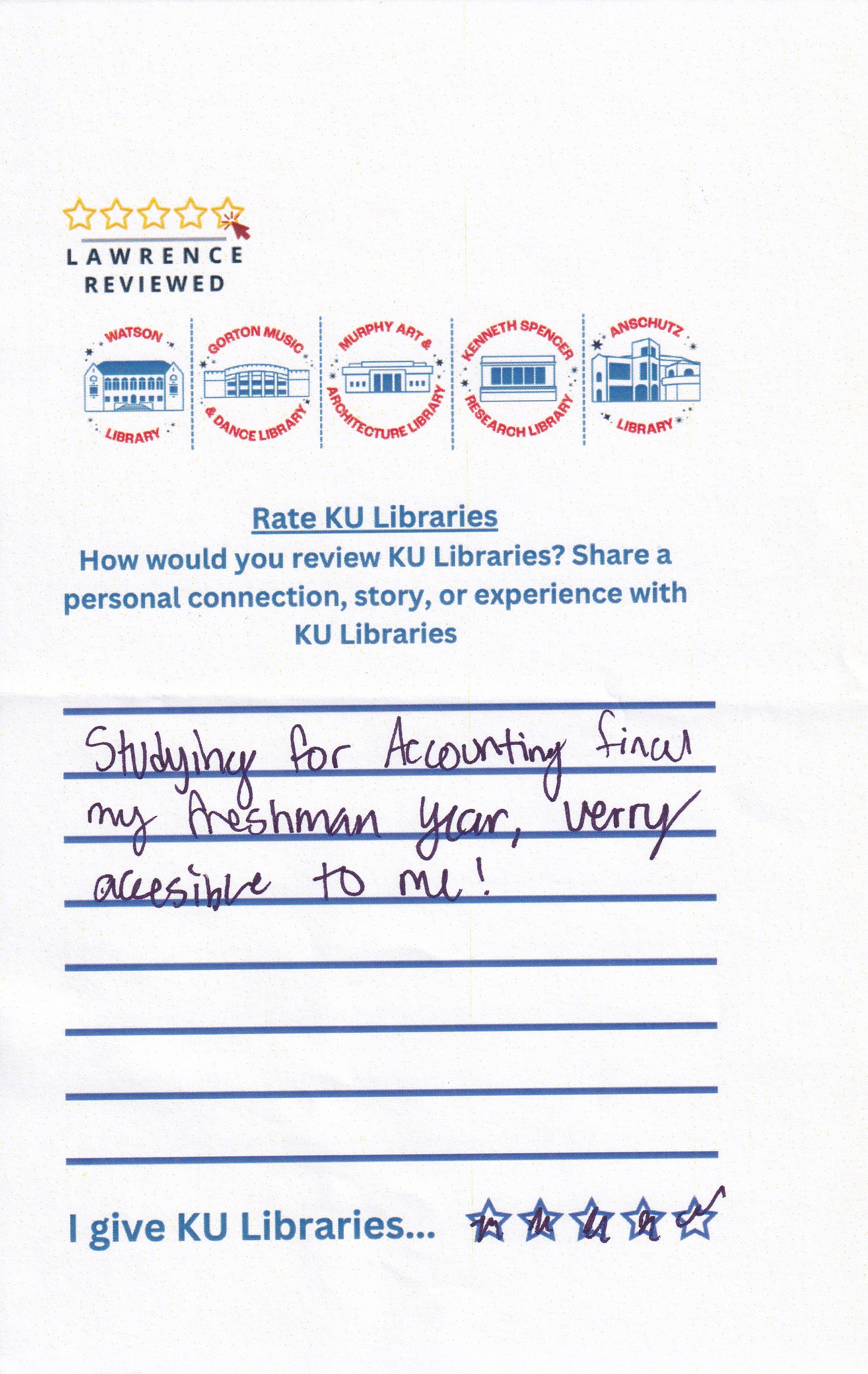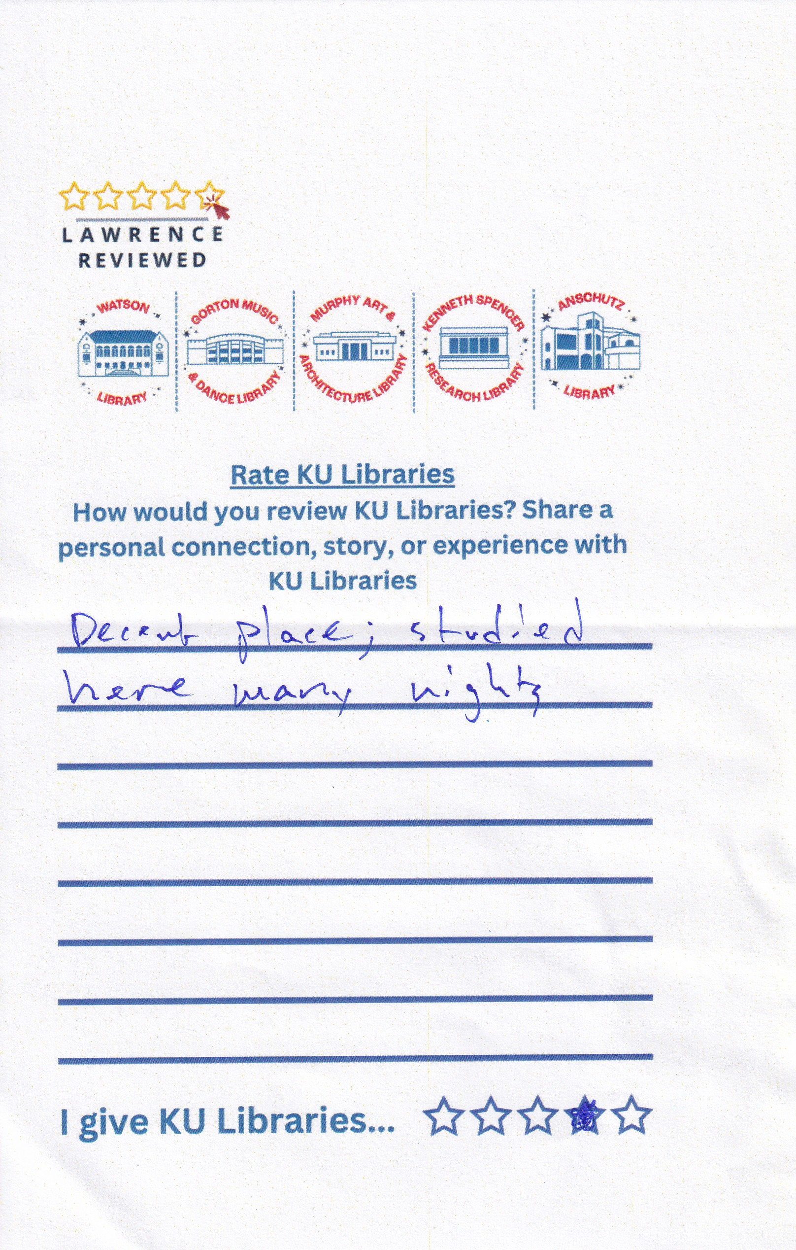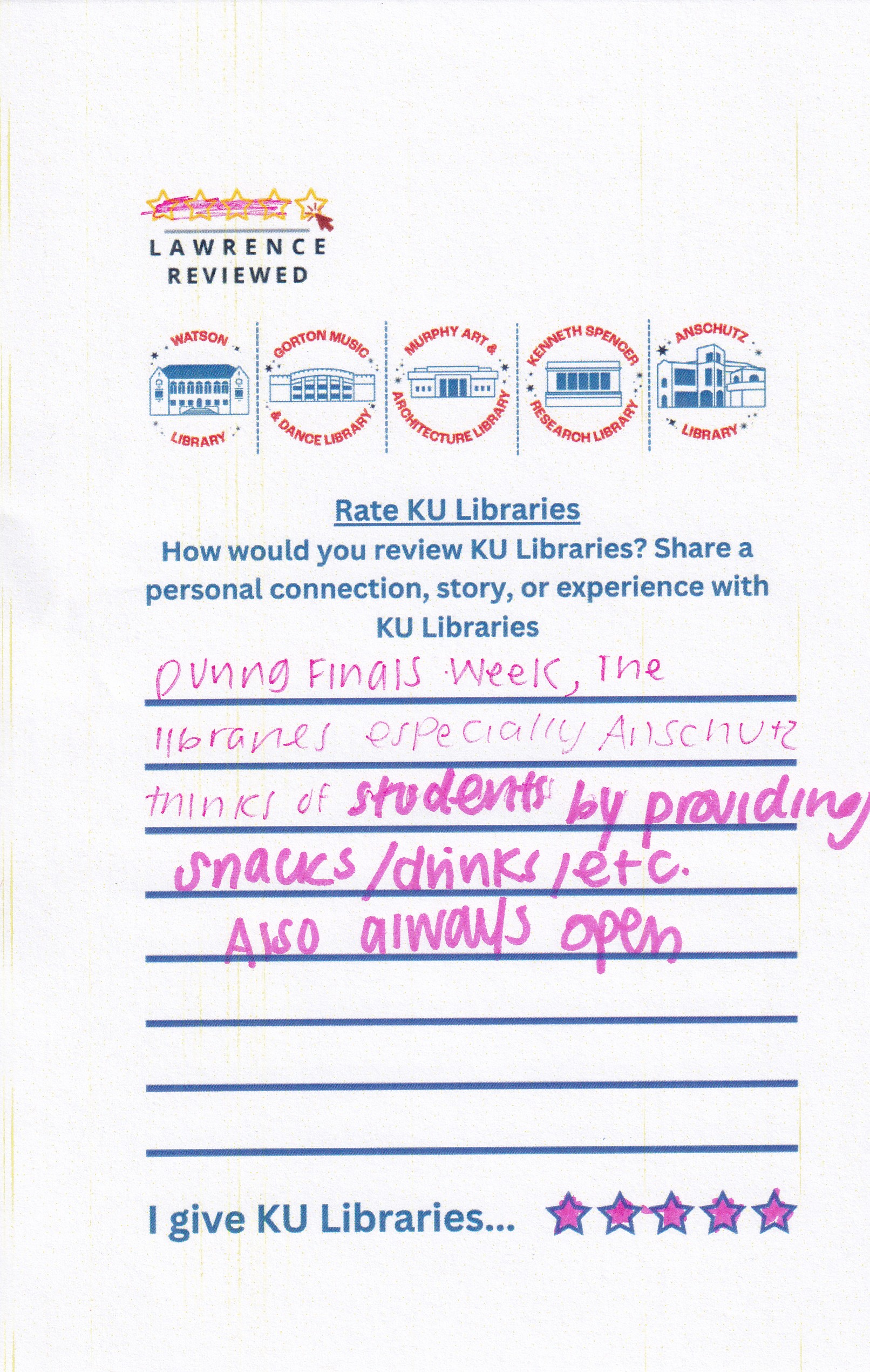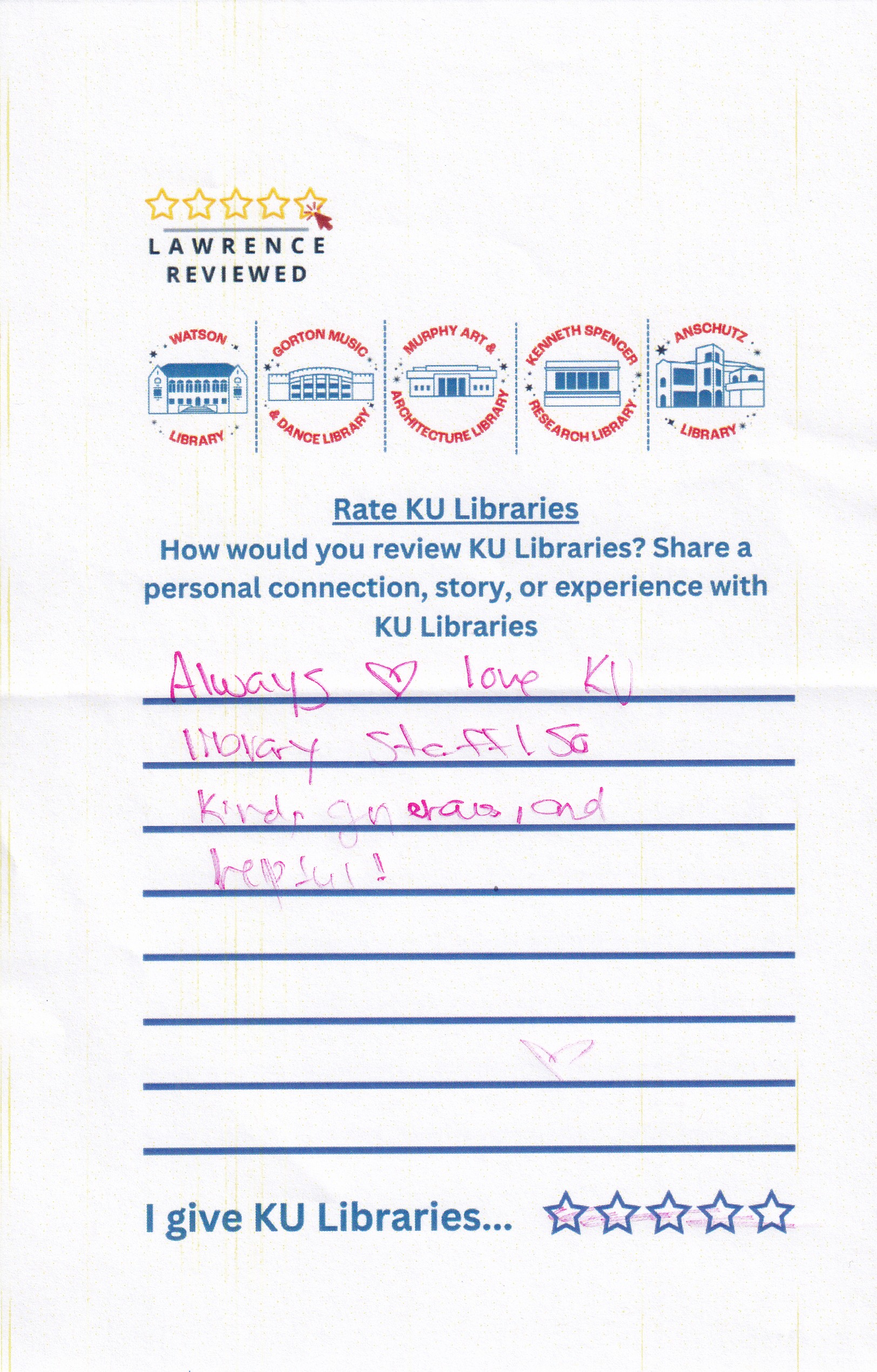 Prompt: How would you review KU Libraries? Share a personal connection, story, or experience with KU Libraries.