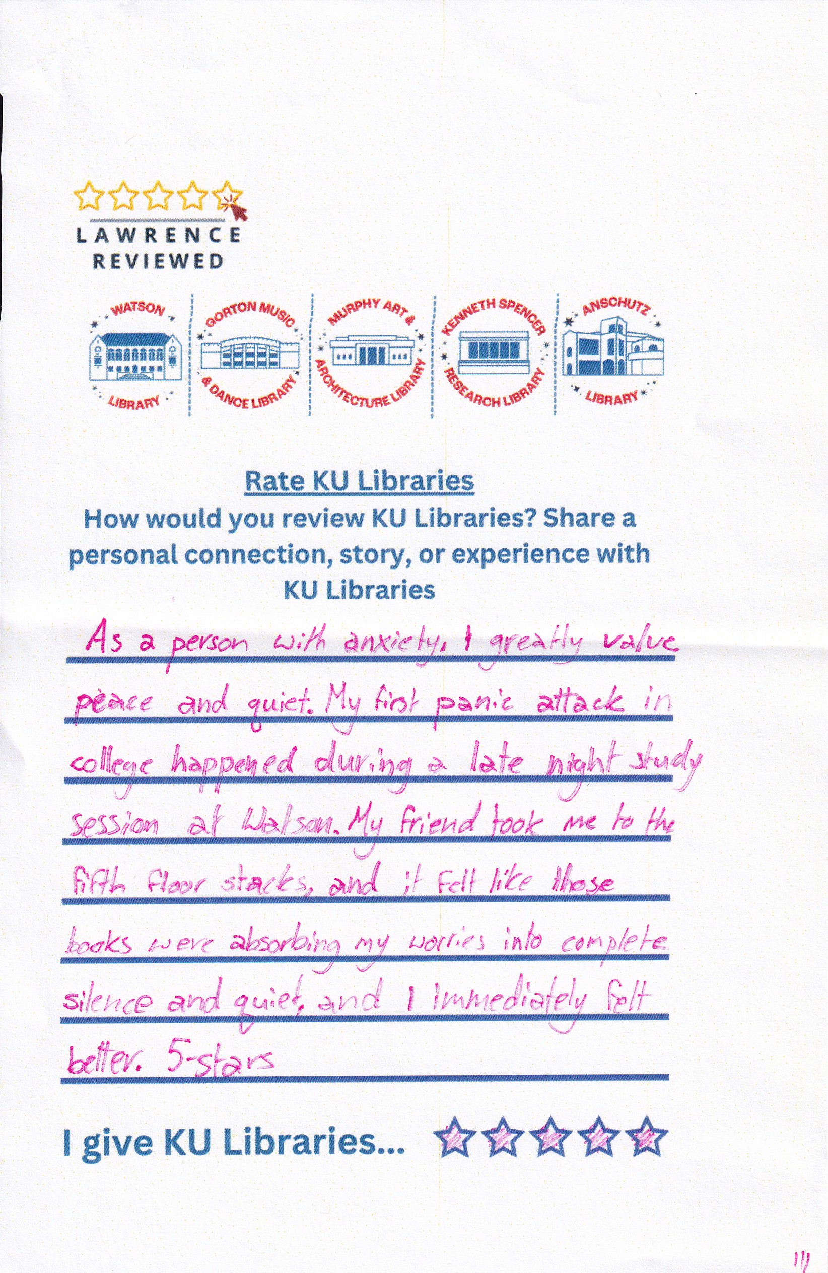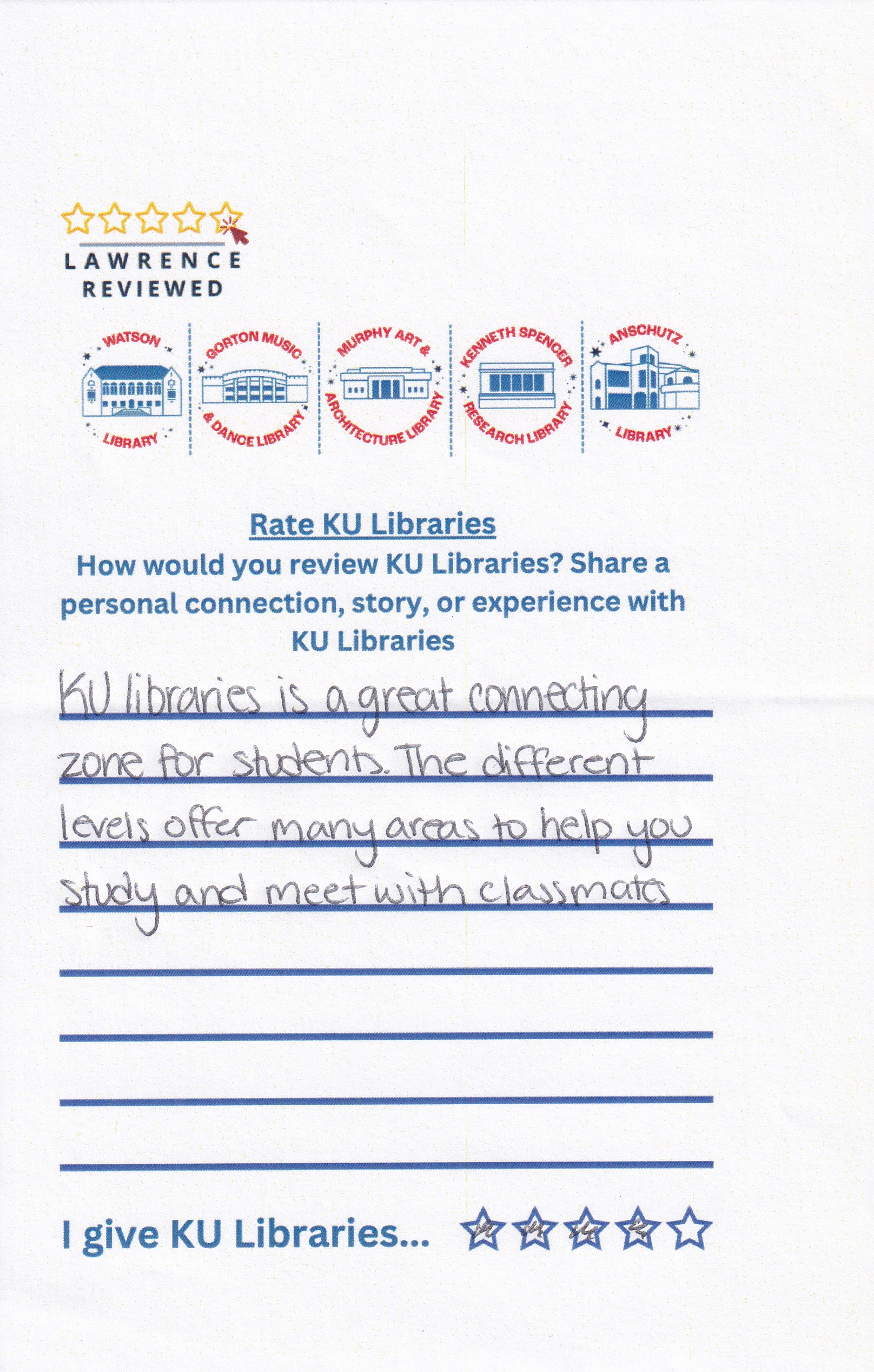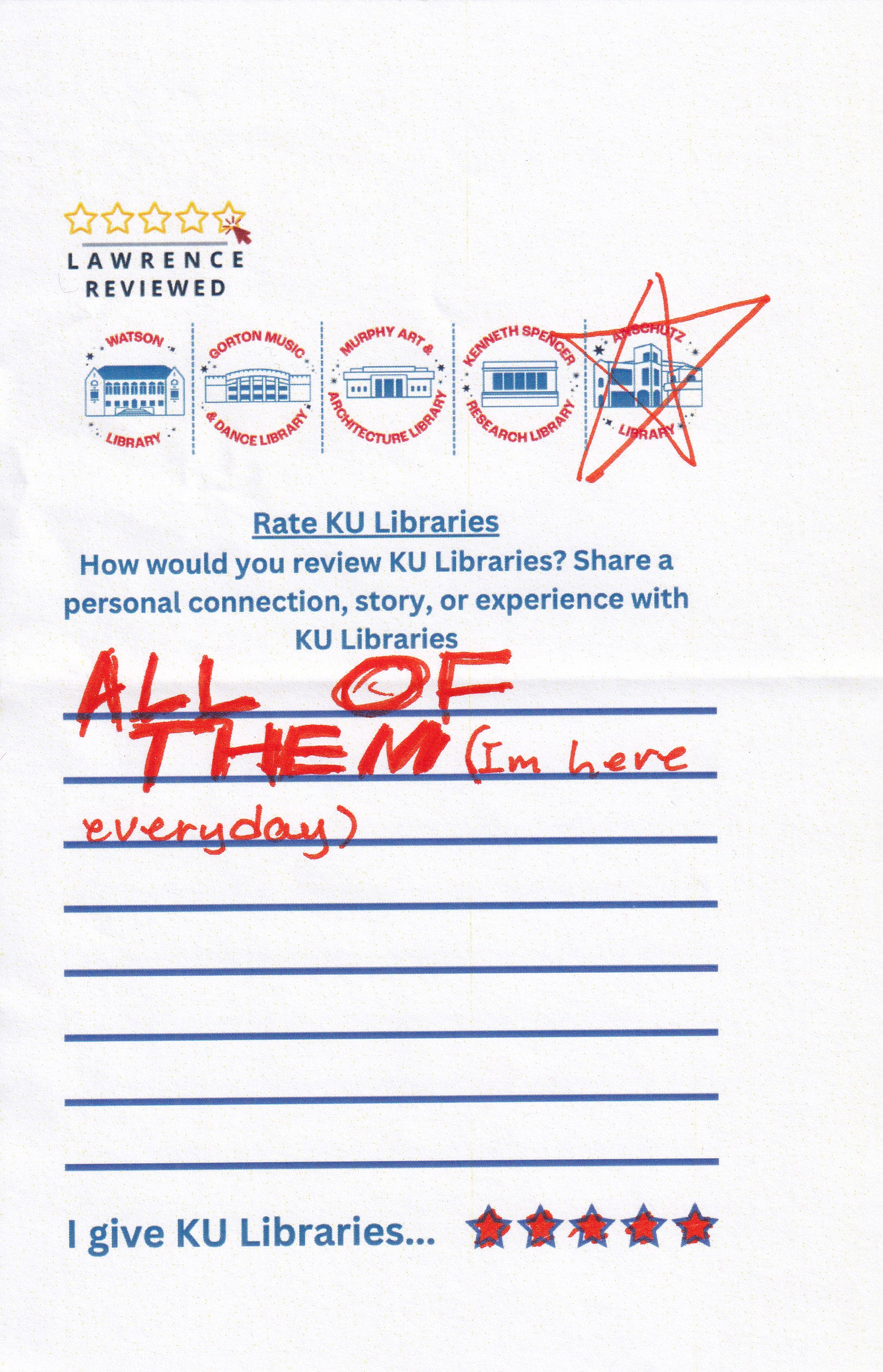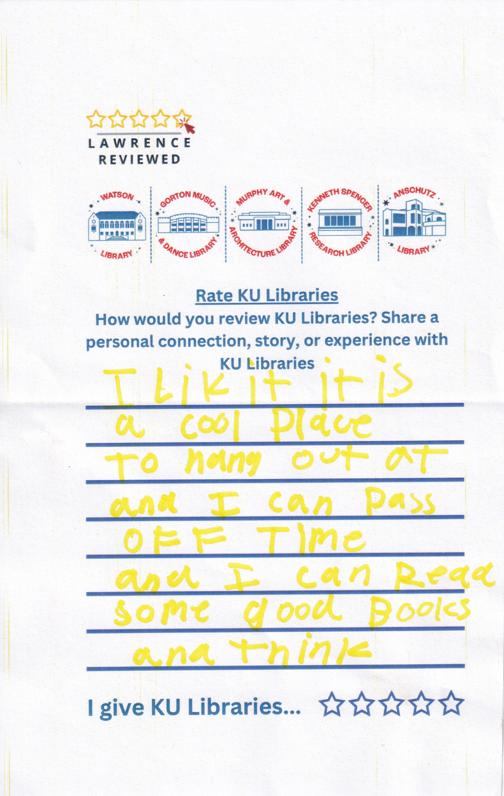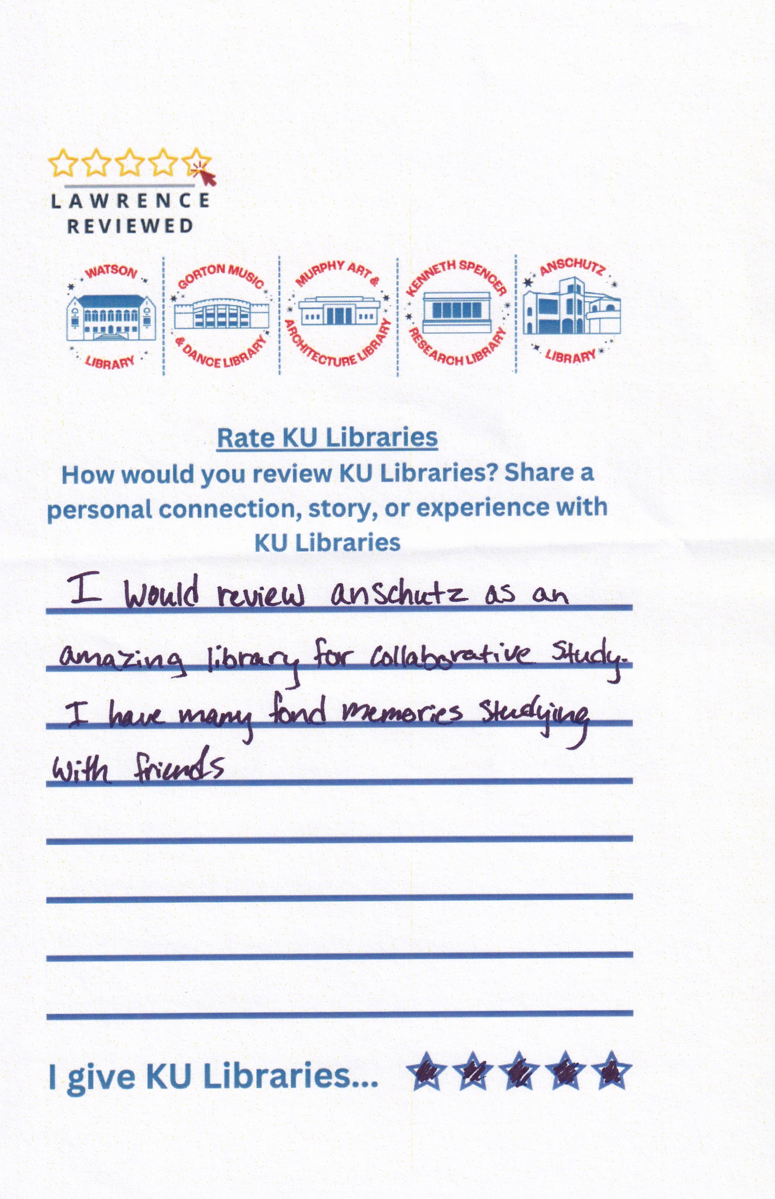 Prompt: How would you review KU Libraries? Share a personal connection, story, or experience with KU Libraries.