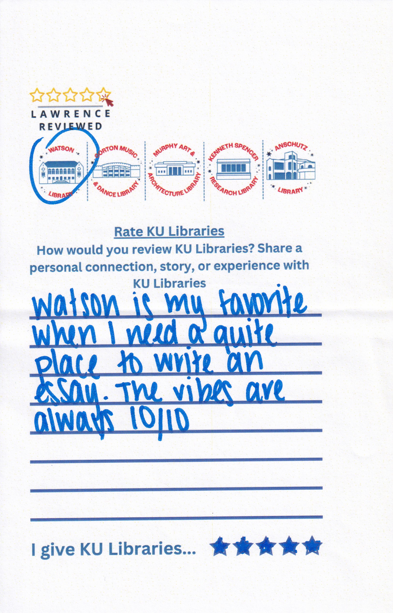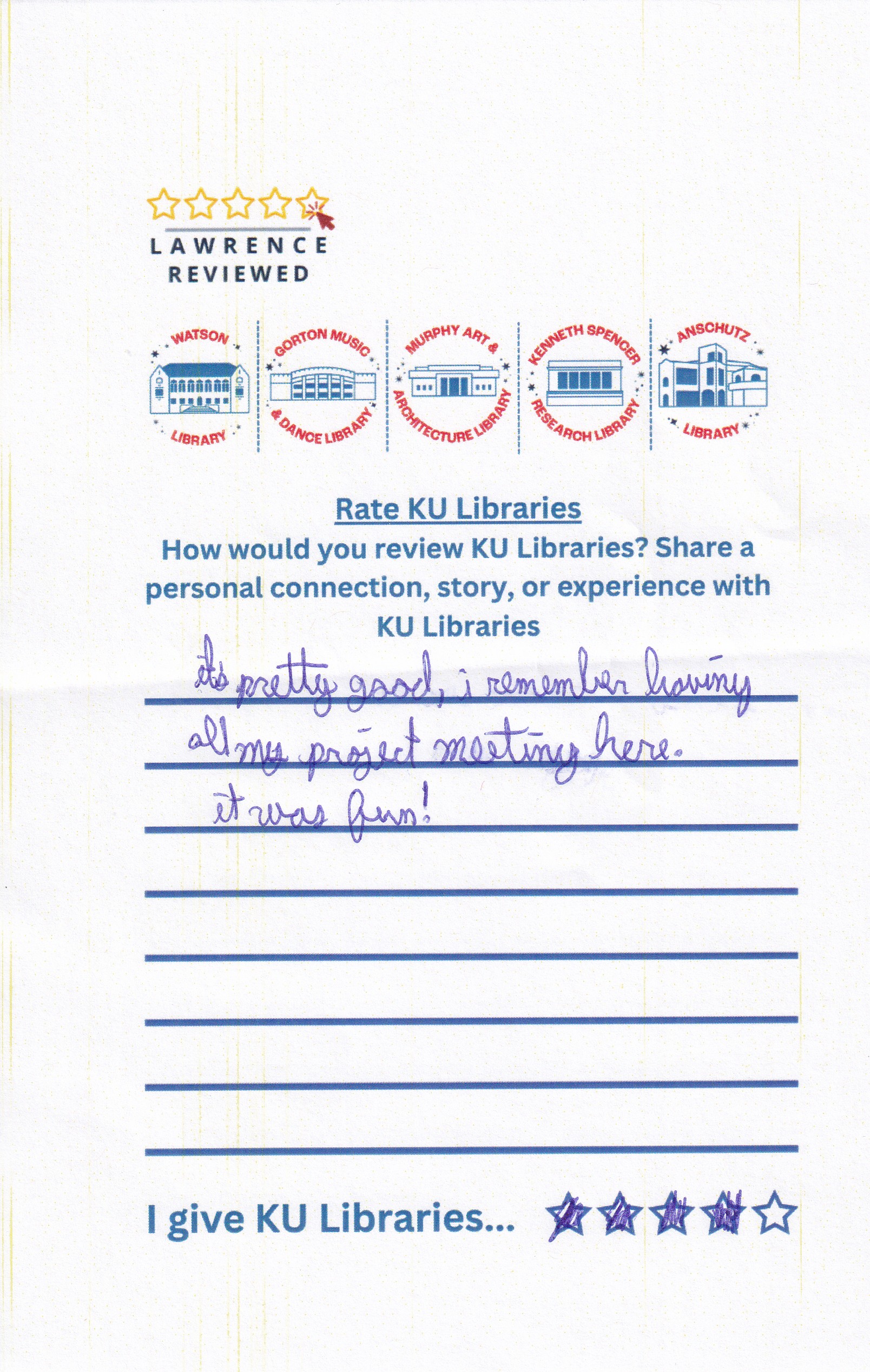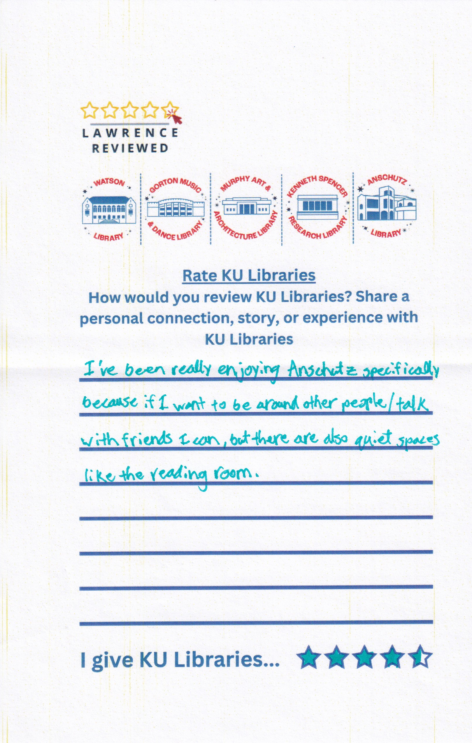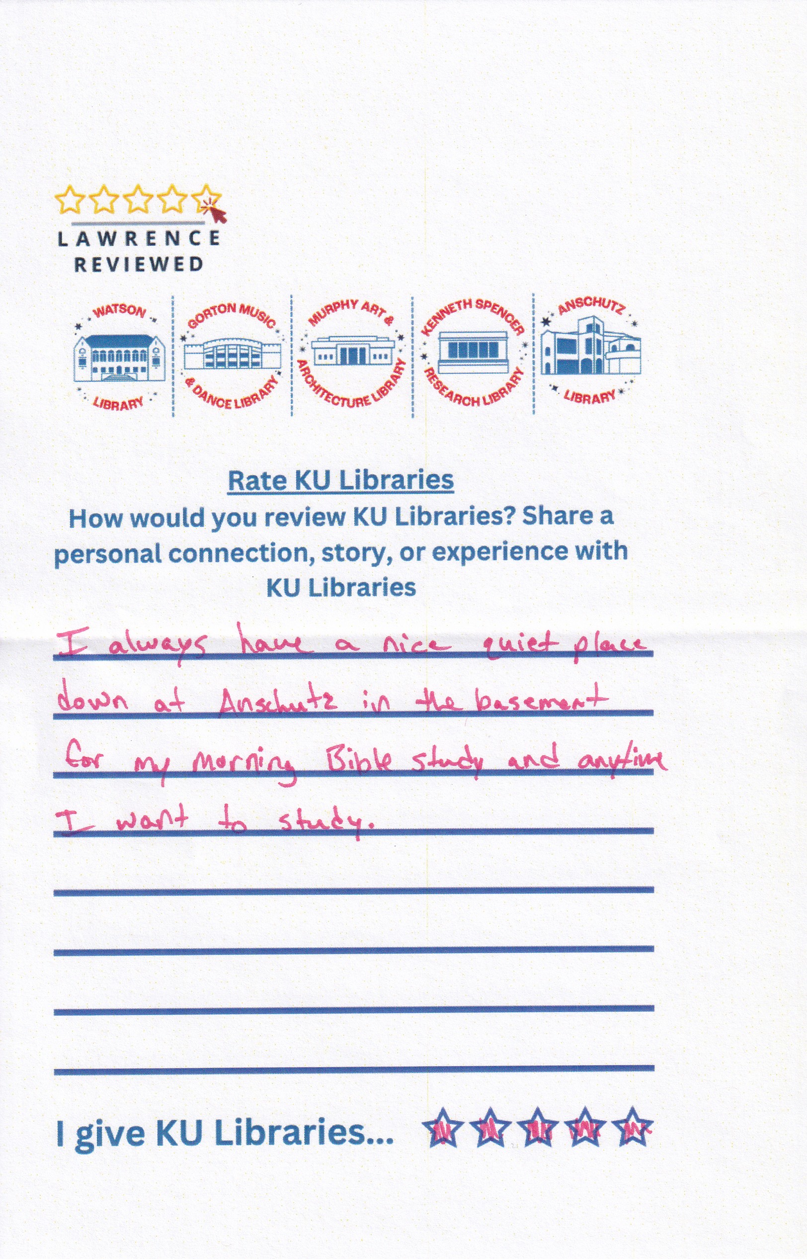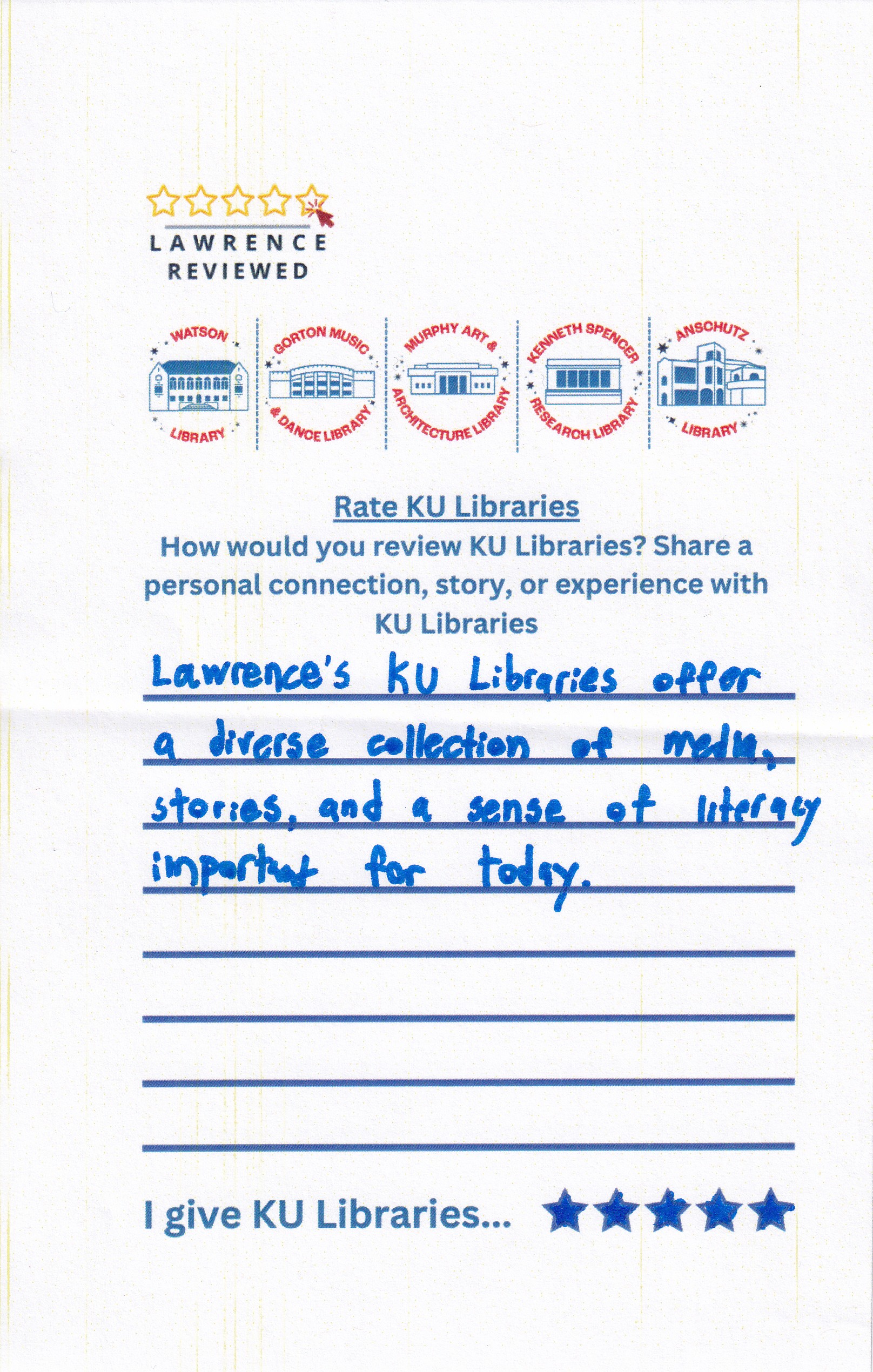 Prompt: How would you review KU Libraries? Share a personal connection, story, or experience with KU Libraries.