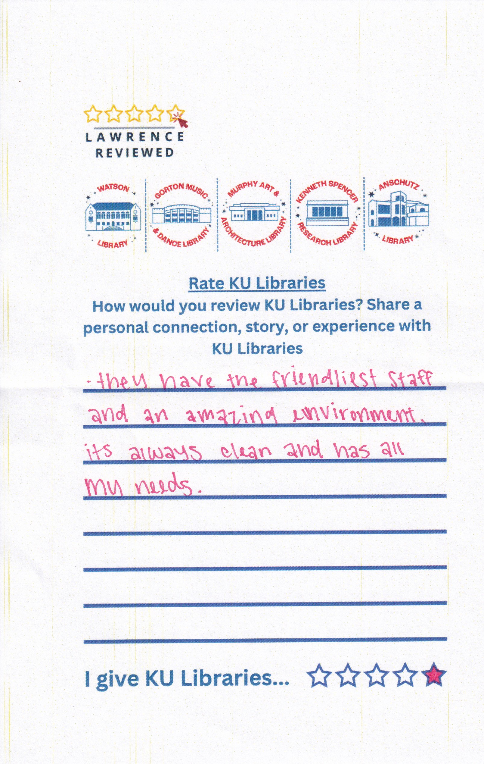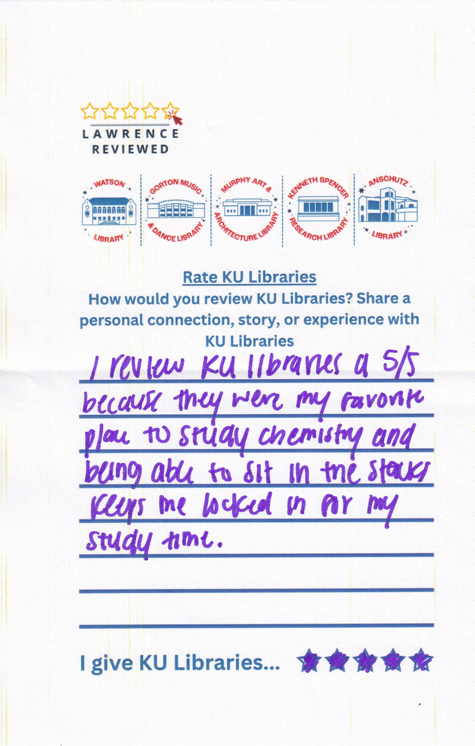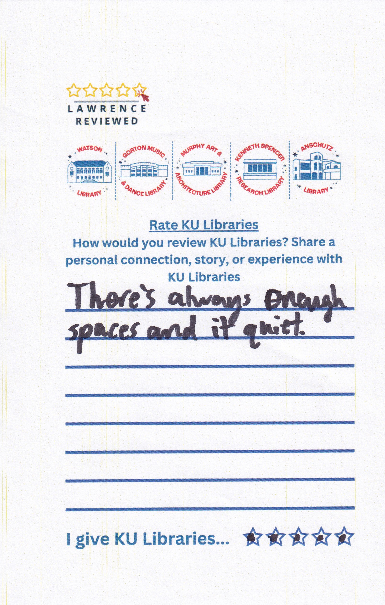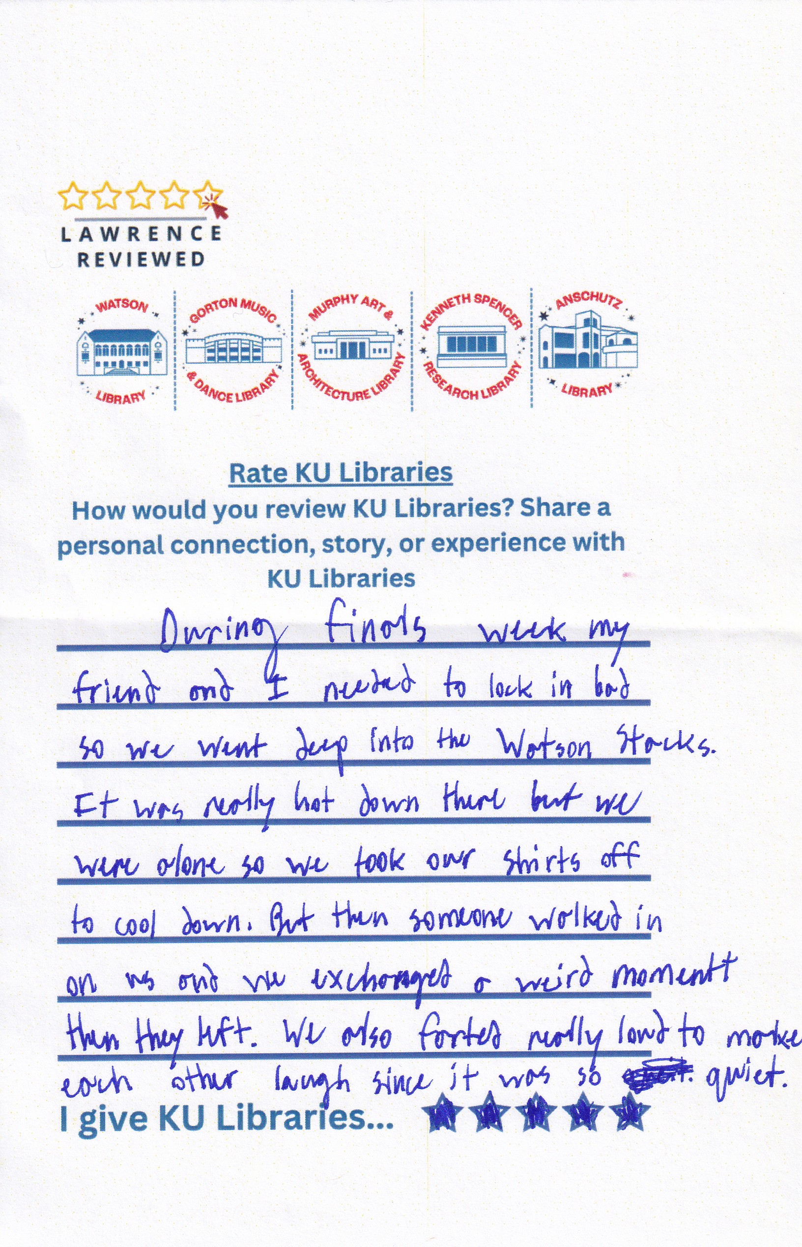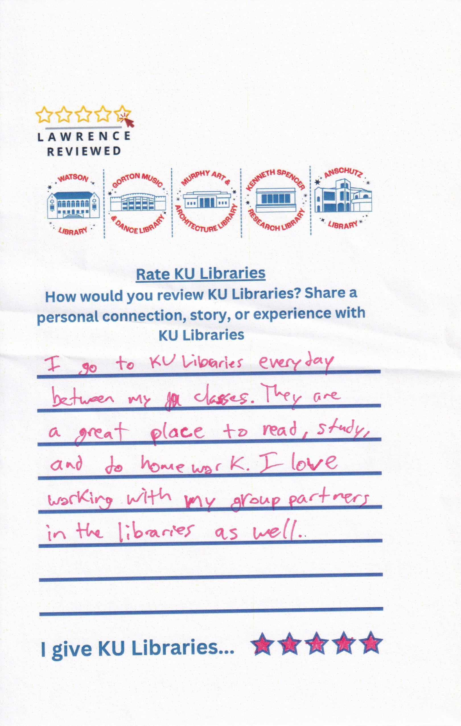 Prompt: How would you review KU Libraries? Share a personal connection, story, or experience with KU Libraries.