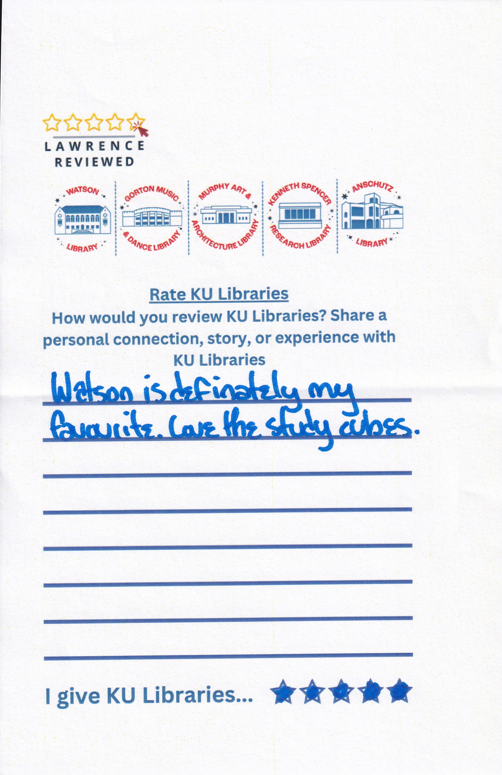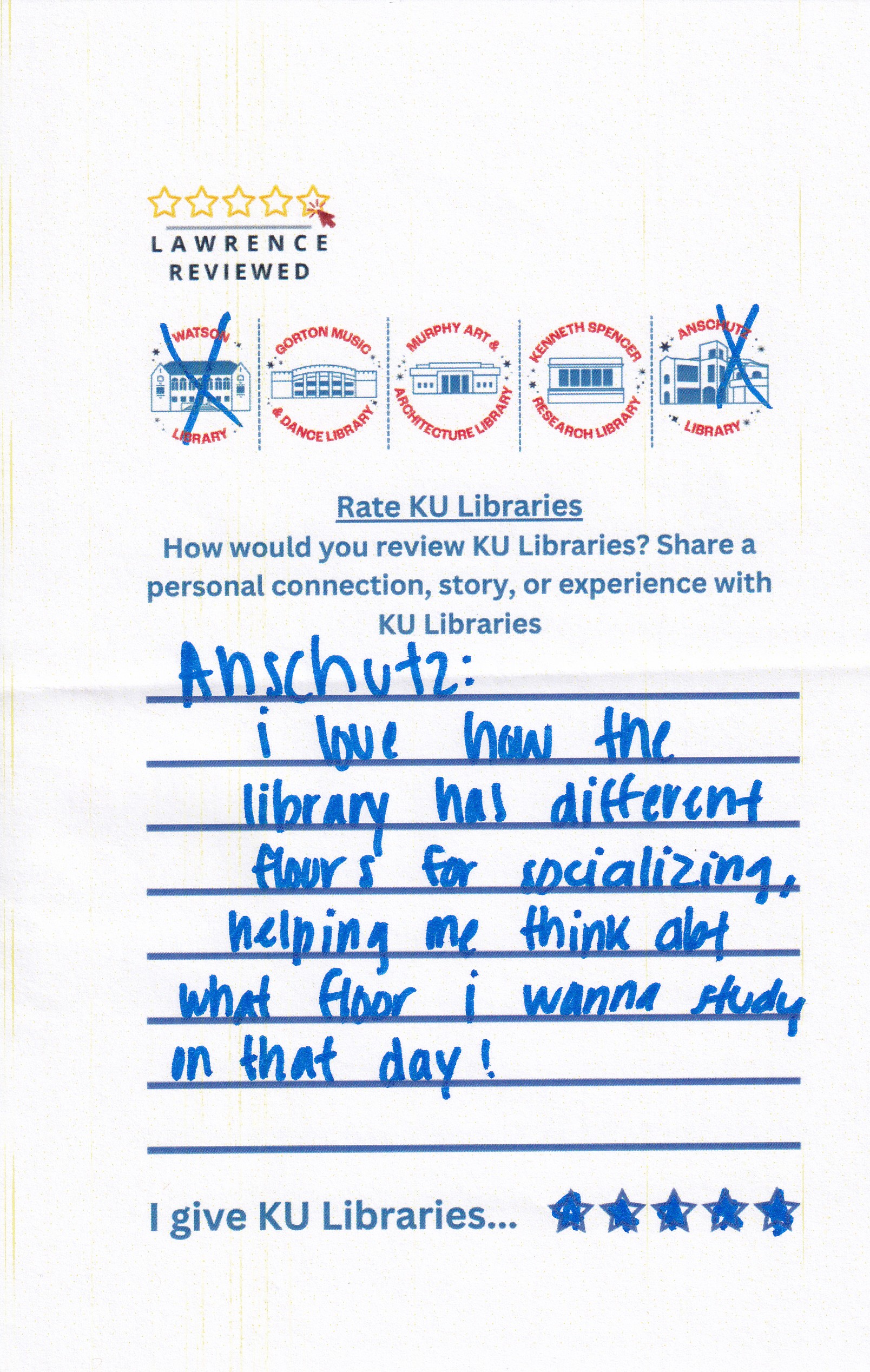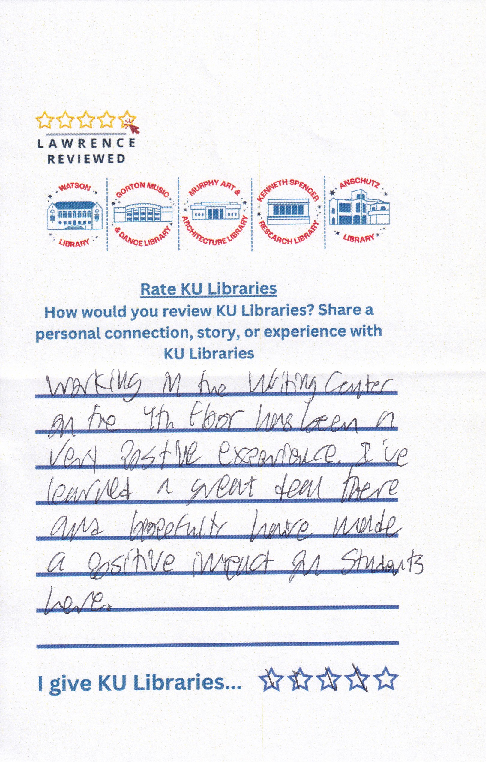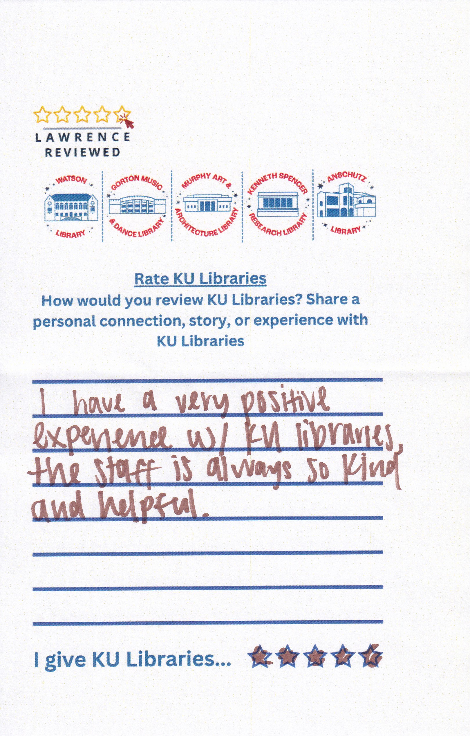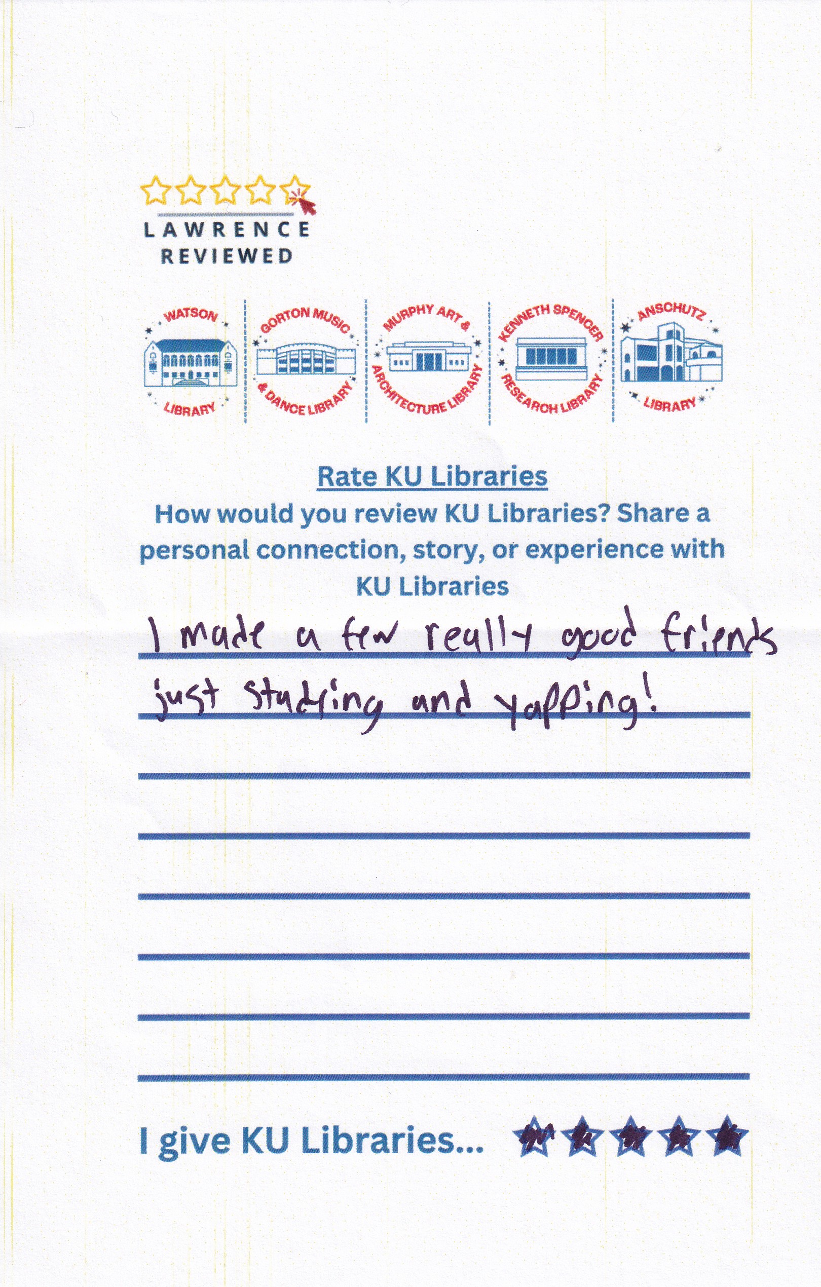 Prompt: How would you review KU Libraries? Share a personal connection, story, or experience with KU Libraries.