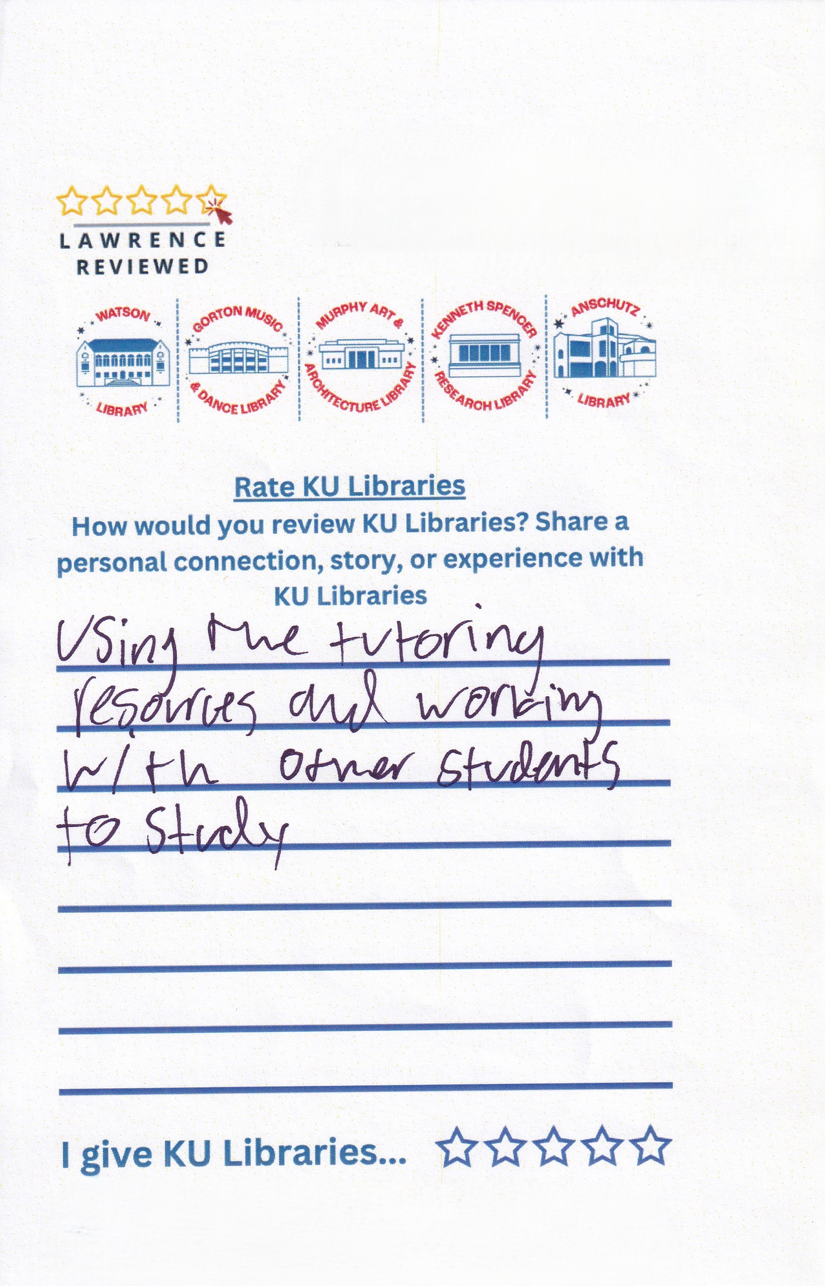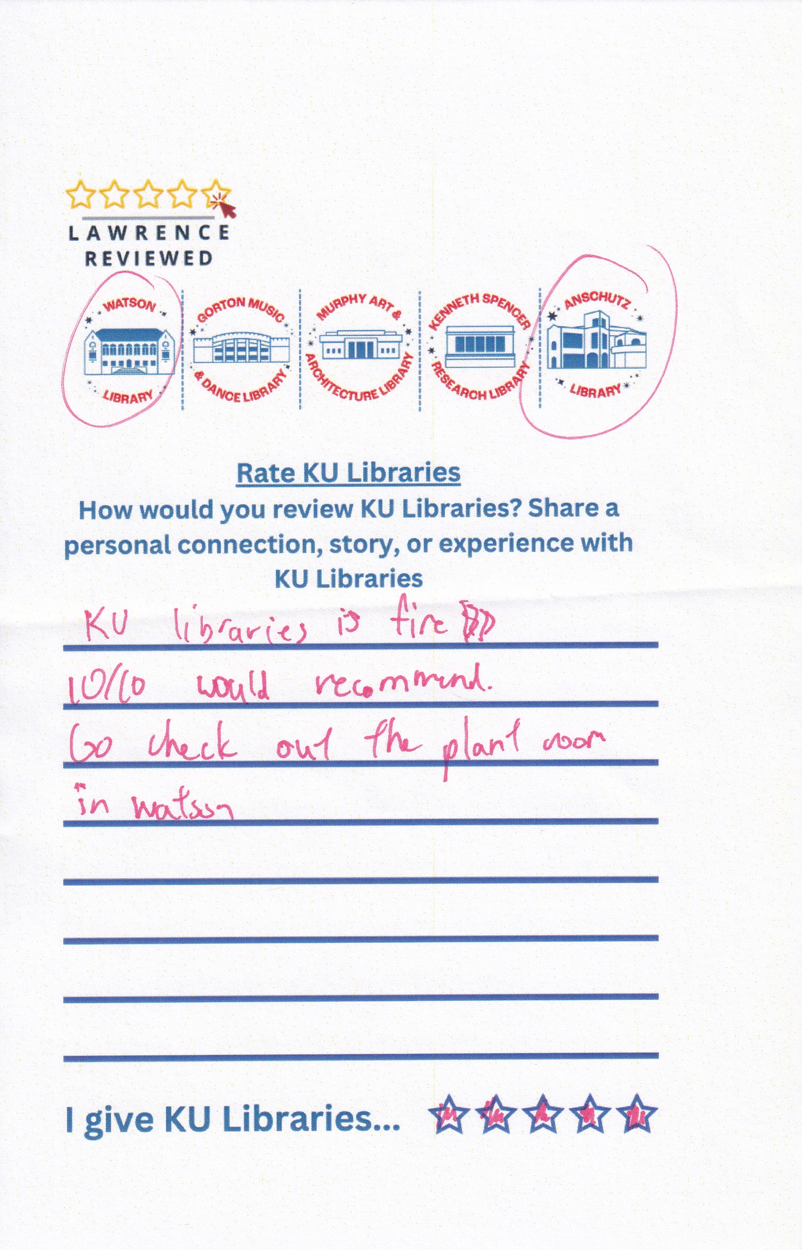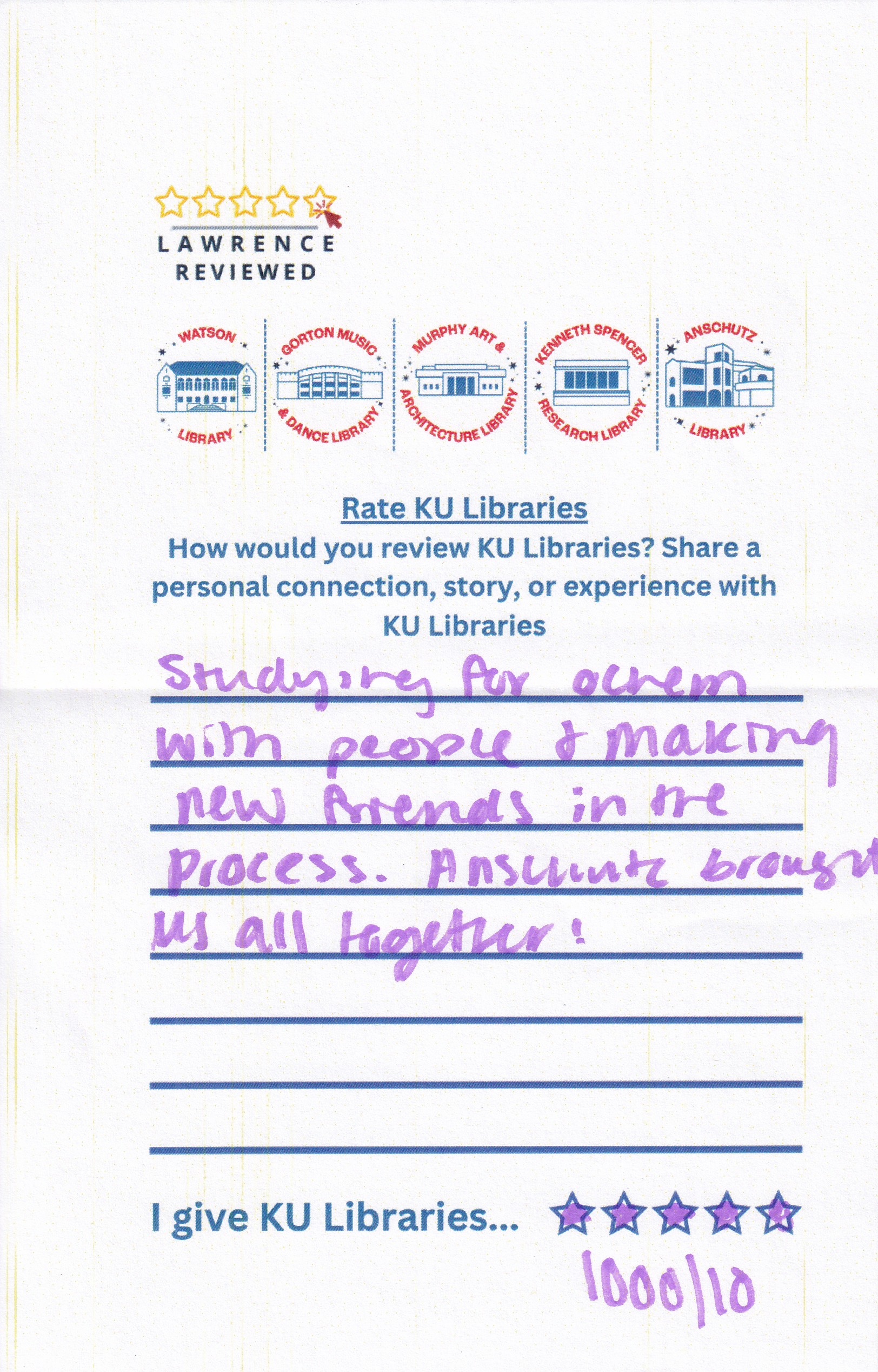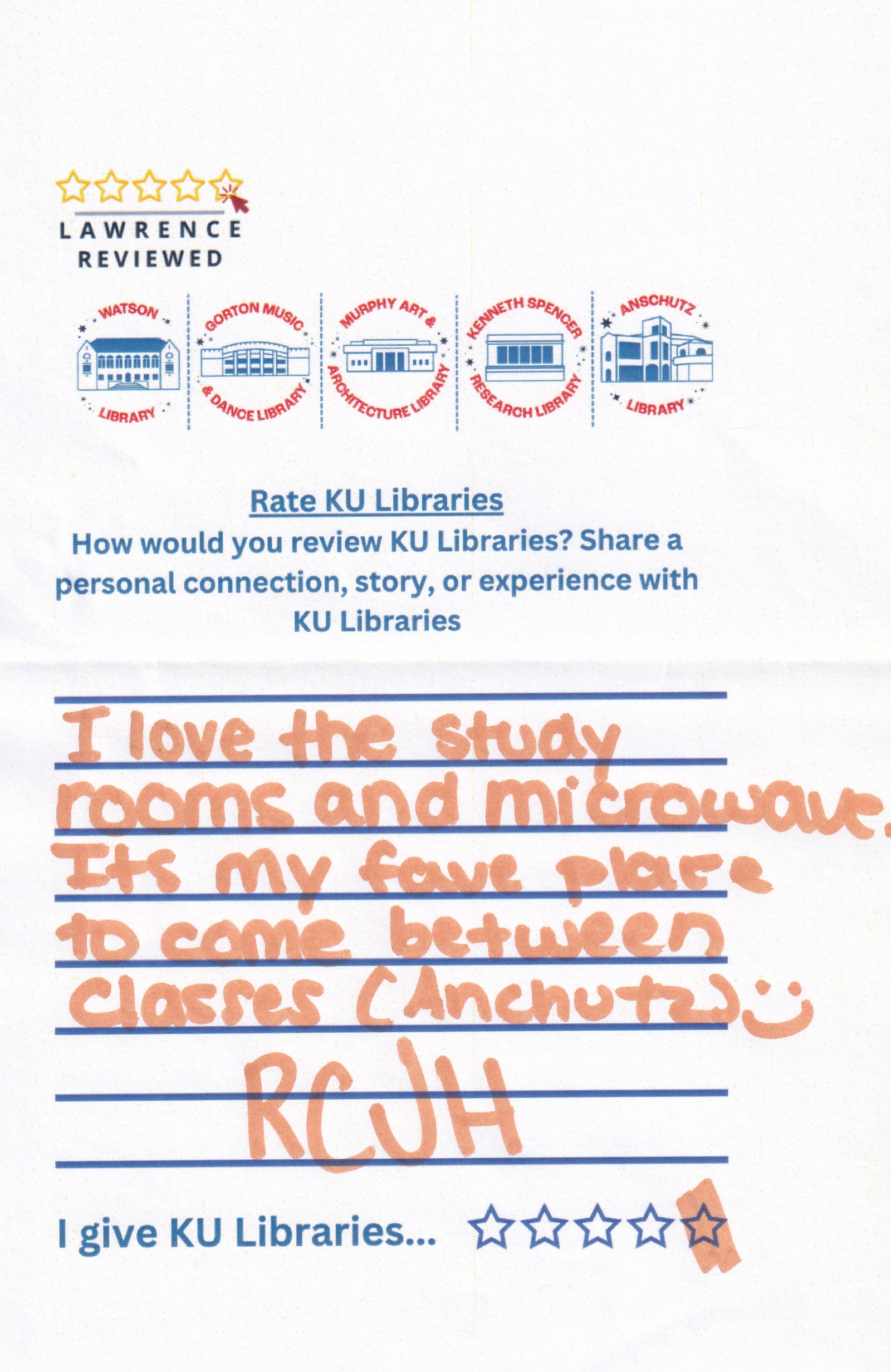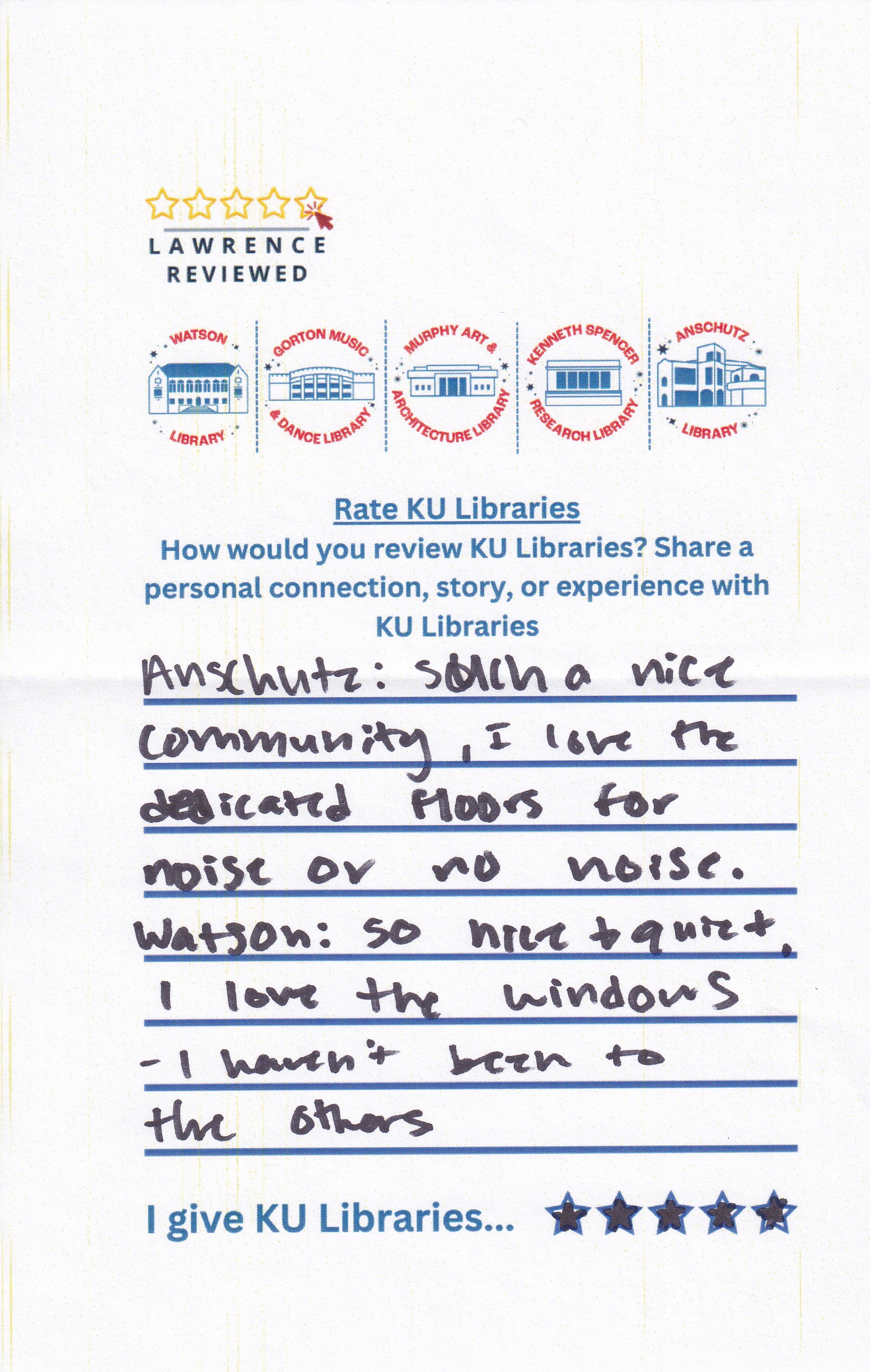 Prompt: How would you review KU Libraries? Share a personal connection, story, or experience with KU Libraries.