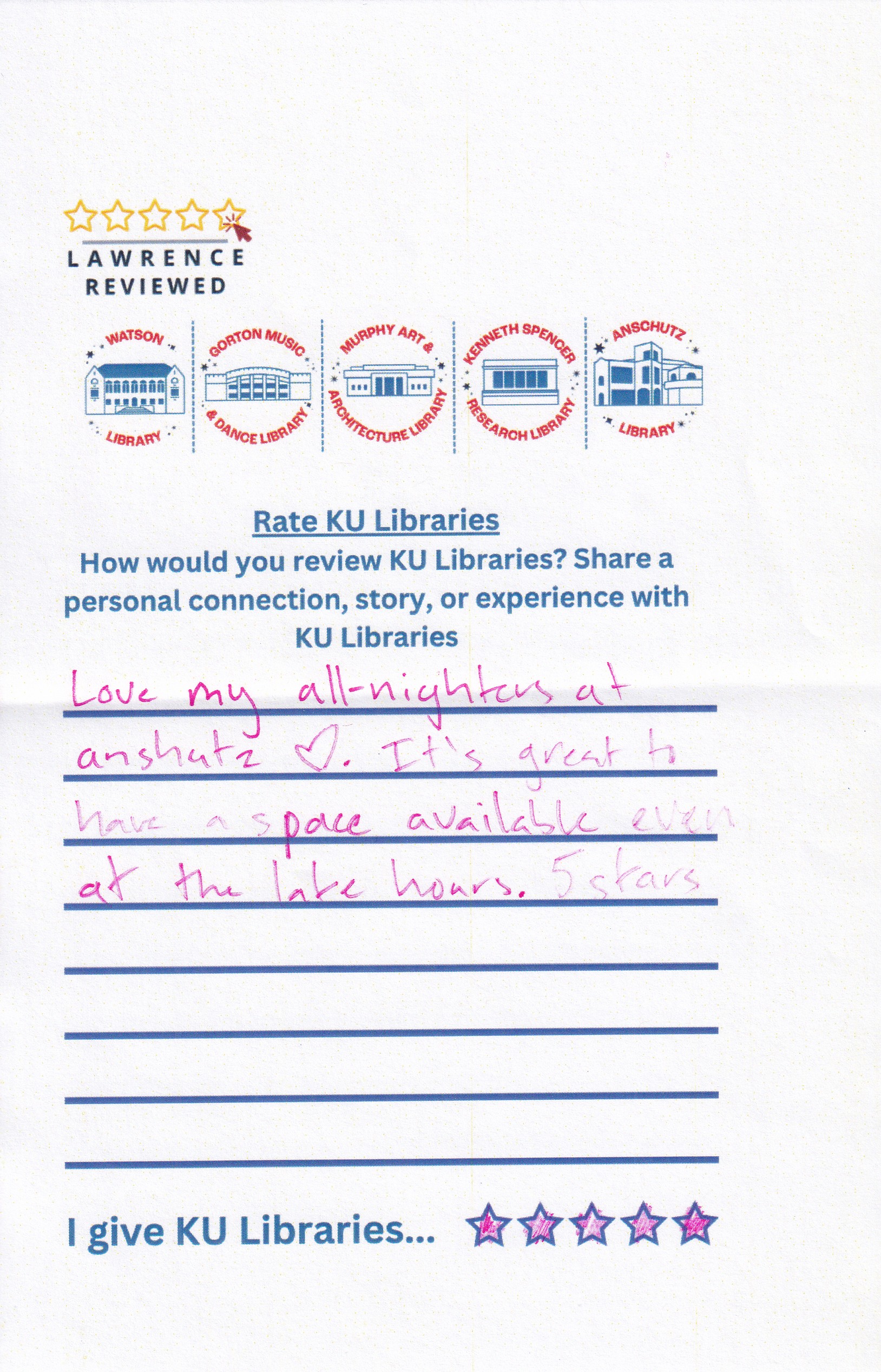 On September 17, 2025, Lawrence Reviewed was invited to host a pop-up event at Anschutz Library. Explore reviews of KU Libraries in the gallery below.